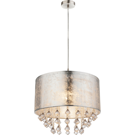GL-15188H3 Závěsné svítidlo, kov nikl matný, plast, textil stříbrný, akrylové křišťály průhledné, Ø40cm, V:140cm, bez žárovky 1xE27, max. 60W 230V. - Amy matný nikl