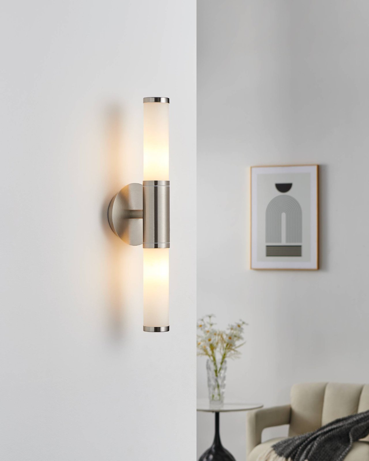 Jednoduché svietidlo Palmera je vyrobené z kovu a bieleho opálového skla. Môže byť umiestnené nad alebo vedľa skrine, horizontálne aj vertikálne. |