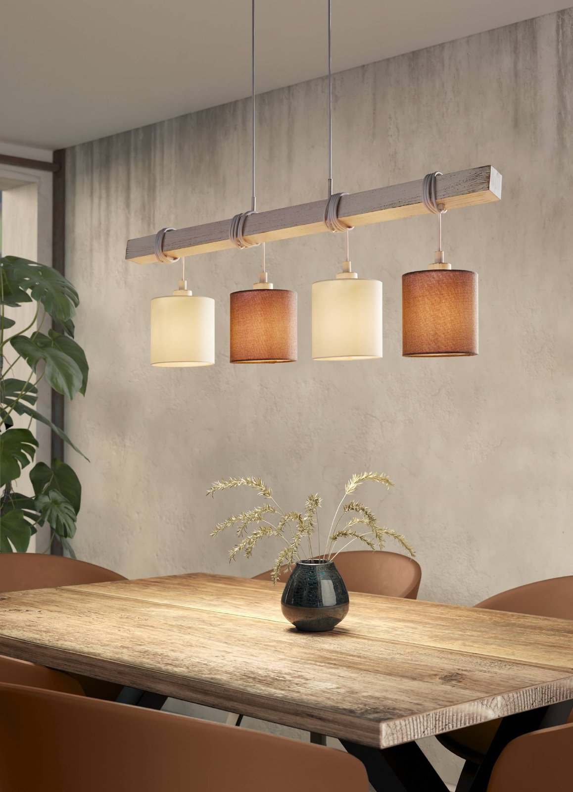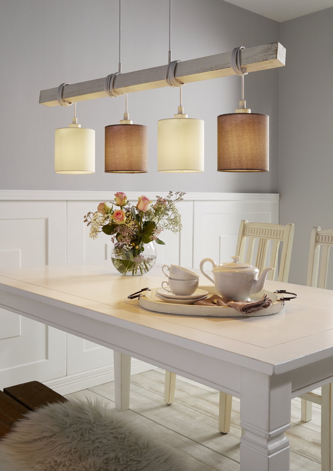 Základňa tohto lustra je vyrobená z dreva v bielej patine z ktorej visia štyri textilné tienidlá. Sú vhodné do interiérov ladených do vintage štýlu. |