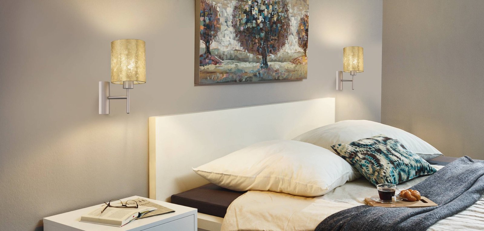Moderné svietidlá Viserbella sú vyrobené z ocele vo farbe champagne a textilu vo farbe zlata. |