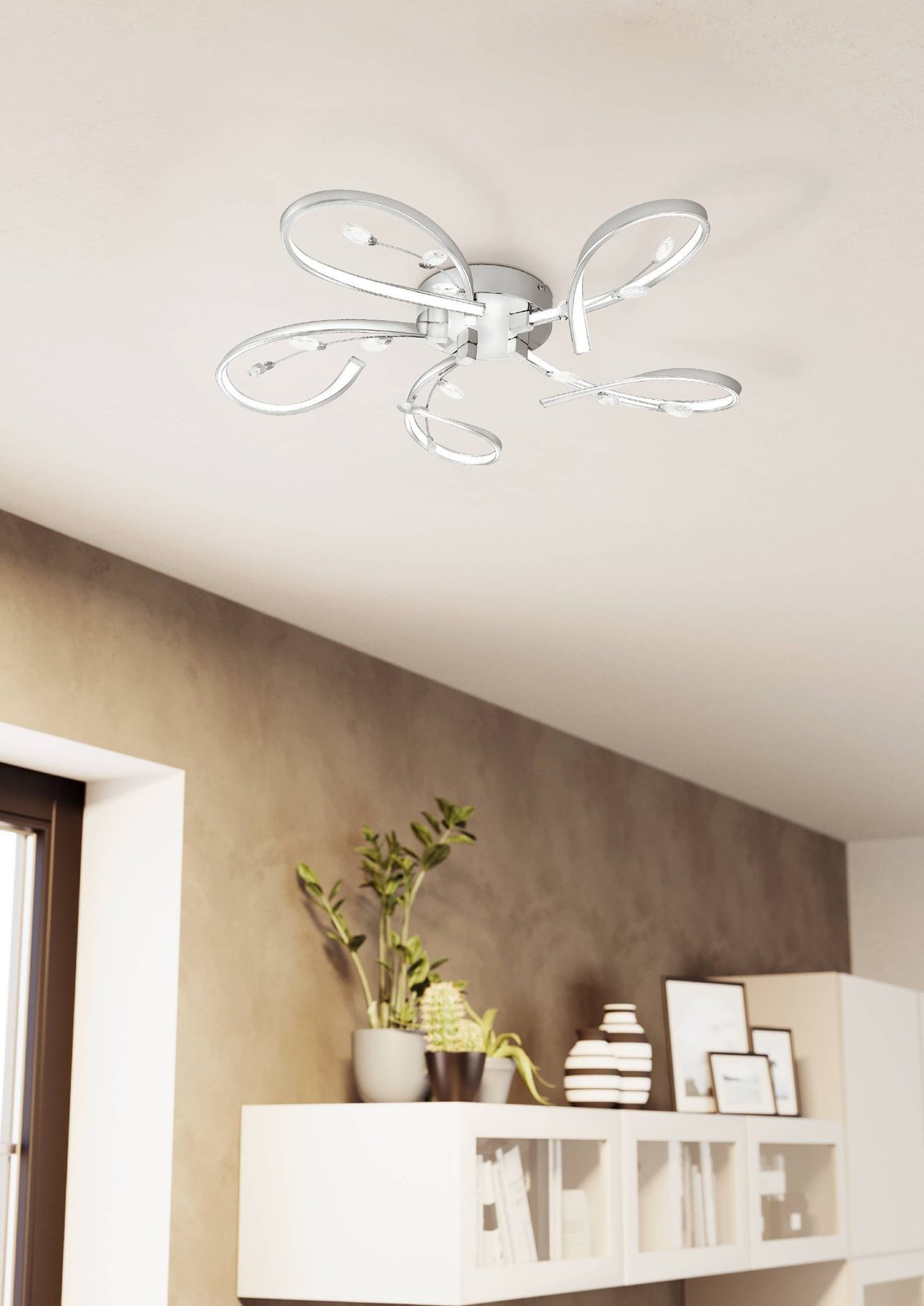 Dizajnové stropné LED svietidlo vyrobené z hliníka a ocele v chrómovej farbe a z plastu s krištáľkami. Svieti teplou bielou farbou a nie je možné ho stmievať.