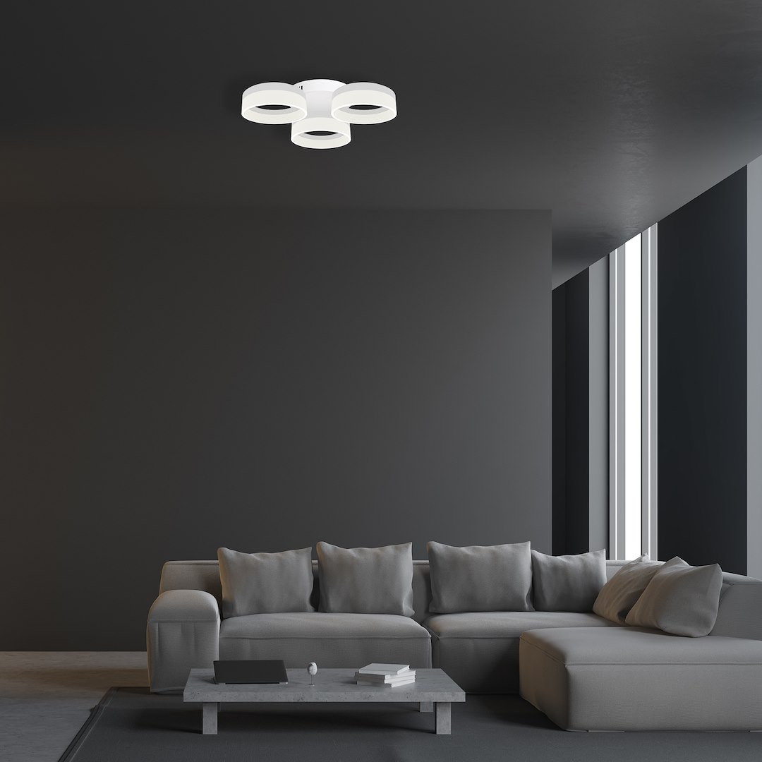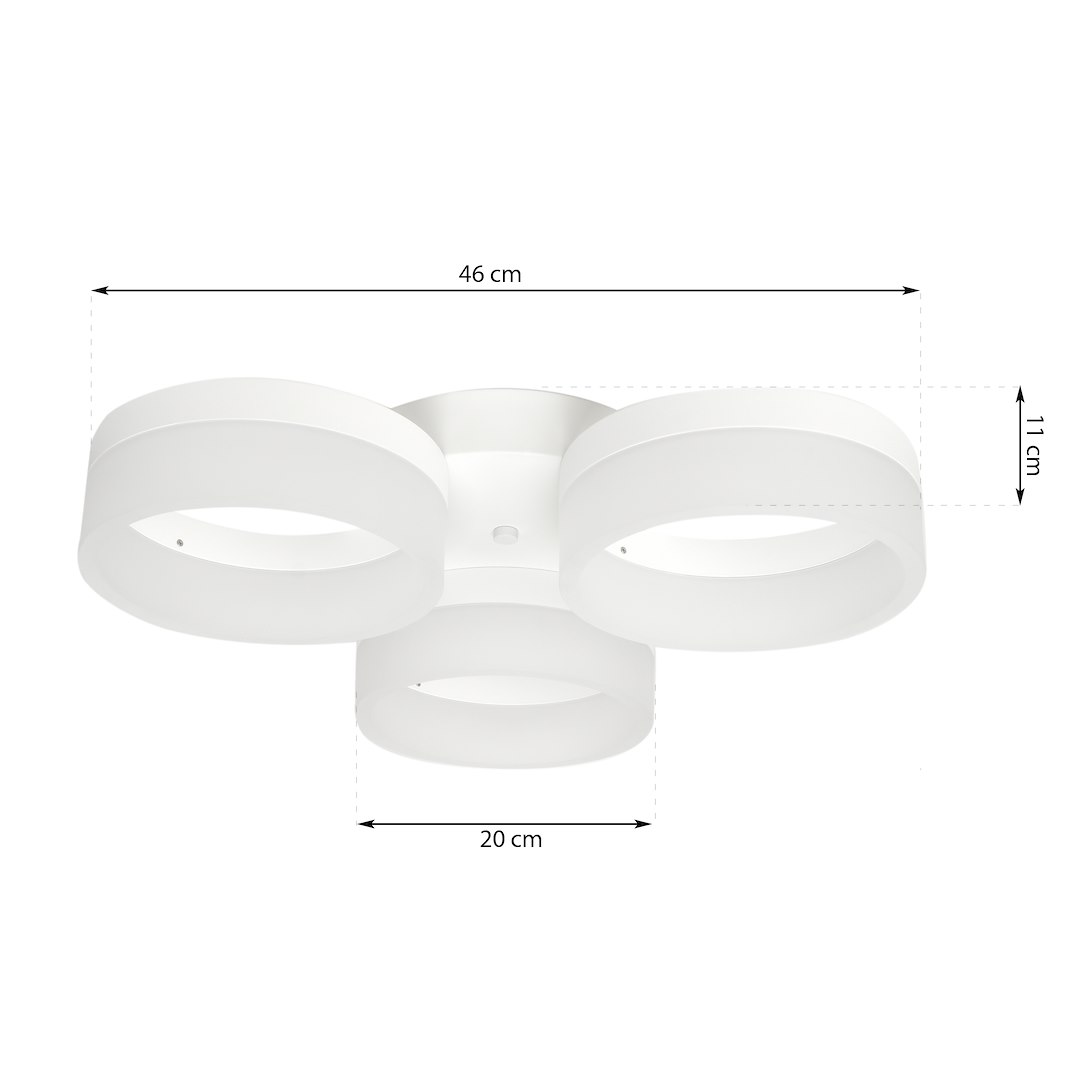 "Plafón v univerzální bílé barvě a moderním designu. Velkorysé rozměry: 52 cm na šířku a 11 cm na výšku skrývají vyměnitelné LED moduly o celkovém výkonu 36 W. Použití LED modulu snižuje náklady na energii, aniž by to mělo vliv na kvalitu světelného zdroje. Oku lahodící barva 4000 K vnáší do místností příjemnou atmosféru a zajišťuje vhodnou náladu. Svítidlo je vyrobeno z vysoce kvalitních materiálů: kovu a akrylu. Součástí dodávky jsou potřebné komponenty pro její montáž. Stínidlo potěší svým estetickým a zároveň jednoduchým tvarem. Tři světelné zdroje ve tvaru kroužků, které jsou na něm umístěny, připomínají elegantní šperky. Lampa úspěšně najde své uplatnění v každé místnosti, ať už se jedná o jídelnu, kuchyň nebo designový obývací pokoj. Na lampu řady Ring poskytuje výrobce záruku 24 měsíců, jejíž součástí je bezplatný záruční servis." |