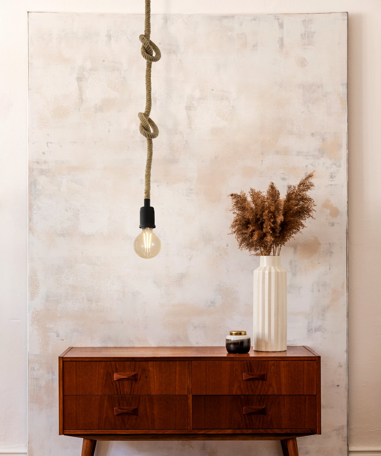 Štýlové svietidlá vo vintage štýle vhodné do kuchýň, jedální a obývacích izieb. Sú vyrobené z ocele a povrazu, na ktorom sú umiestnené snítidla. |