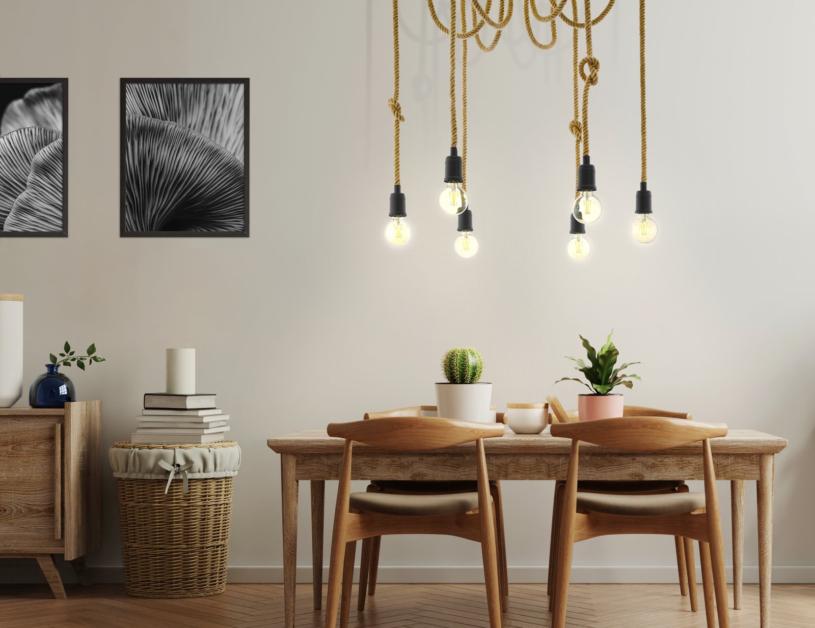 Štýlové svietidlá vo vintage štýle vhodné do kuchýň, jedální a obývacích izieb. Sú vyrobené z ocele a povrazu, na ktorom sú umiestnené snítidla. |