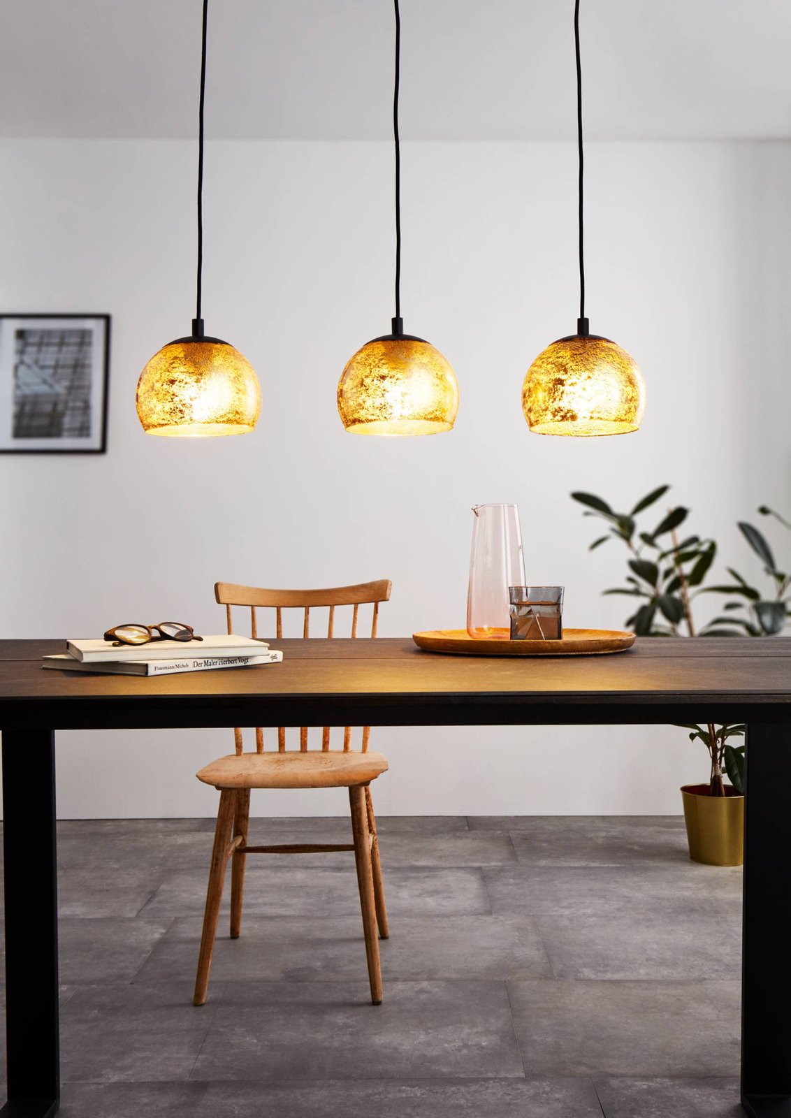Pekné moderné svietidlá vhodné predovšetkým do kuchýň a jedální nad kuchynský stôl alebo kuchynský ostrovček. Sú vyrobené z ocele v čiernej farbe a skla v zlatej farbe. Je možné ich osadiť chytrou LED žiarovkou a ovládať ich cez chytrý telefón, stmievať ich alebo meniť farbu svietenia. |