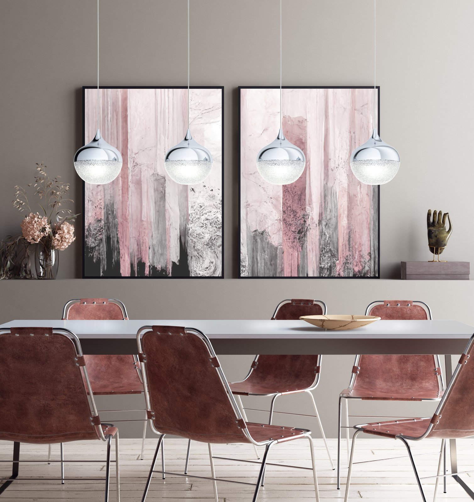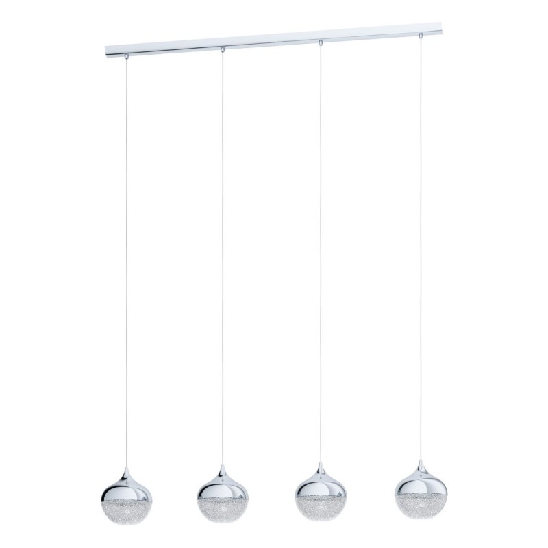 Zaujímavé moderné lustre vhodné predovšetkým do obývacej izby, kuchyne a jedálne. Základňa je vyrobená z ocele v chrómovej farbe a tienidlo v tvare gule je z plastu v čírej farbe s bielymi granulami, ktoré sa po rozsvietení třpití a svietidlu dodávajú nádych luxusu. |