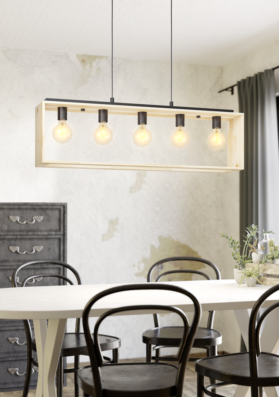 Štýlové závesné svietidlá vyrobené z ocele v čiernej farbe a z dreva v prírodnej farbe. V obývacej izbe, jedálni a kuchyni vytvorí zaujímavý prvok.