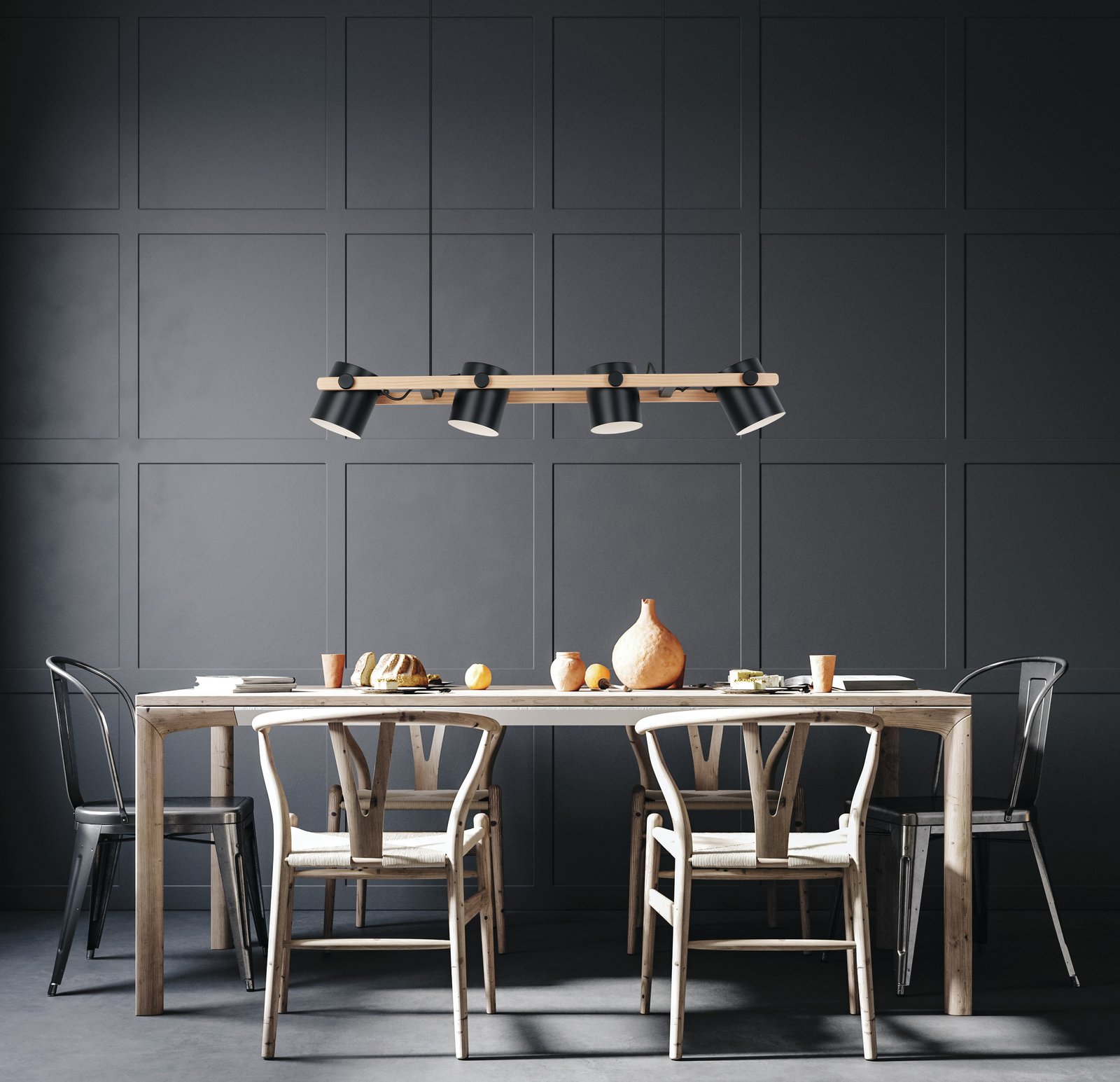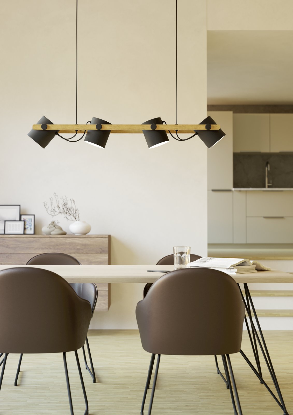 Moderné, štýlové svietidlá vyrobené z ocele v čiernej a krémovej farbe a z dreva v hnedej farbe. Hlavy, ktoré sú umiestnené na drevenej základni sú pohyblivé do strán a je možné ich natočiť tam, kam práve potrebujete svietiť.