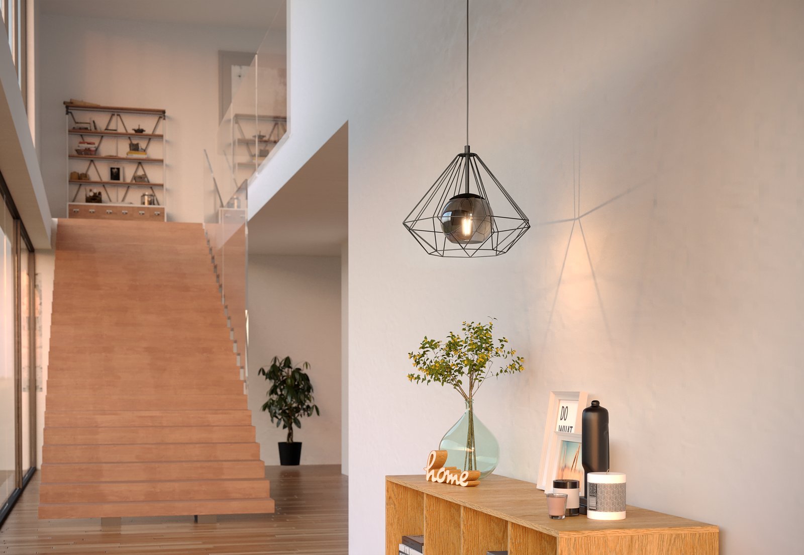 Štýlové lustre vyrobené z ocele v čiernej farbe a z dymového skla. V tienidle z oceľových drôtov je schovaná sklenená guľa. Tieto svietidlá budú zaujímavým prvkom vo vašej modernej domácnosti. |