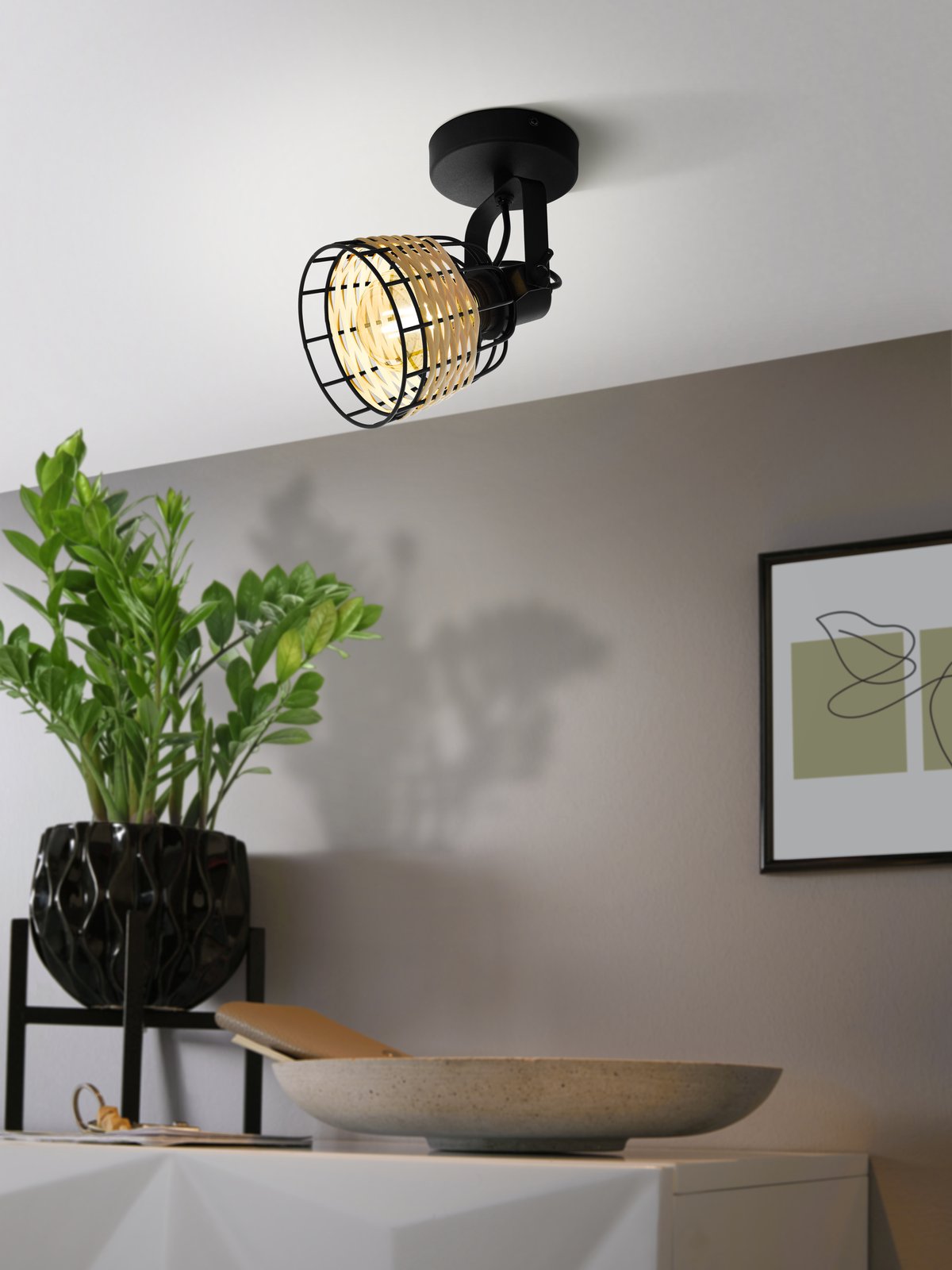 Veľmi zaujímavé bodové svietidlá Anwick sú vyrobené z kovu v čiernej farbe a tienidlá sú z ratanu v prírodnej hnedej farbe. Ratan kryje žiarovku, aby neoslňovala. |