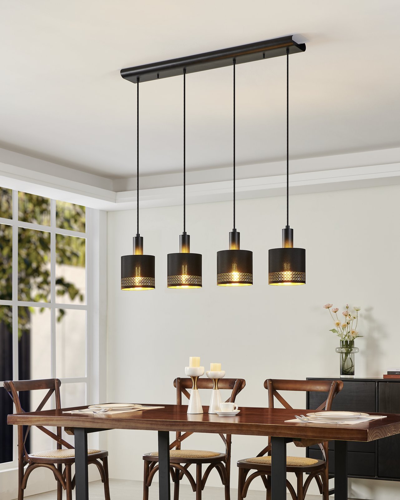 Veľmi zaujímavé a moderné svietidlá Esteperra sú vyrobené z ocele v čiernej farbe a textilu v čiernej a zlatej farbe. Použitím týchto svietidiel docielite ucelený celok v interiéri. |