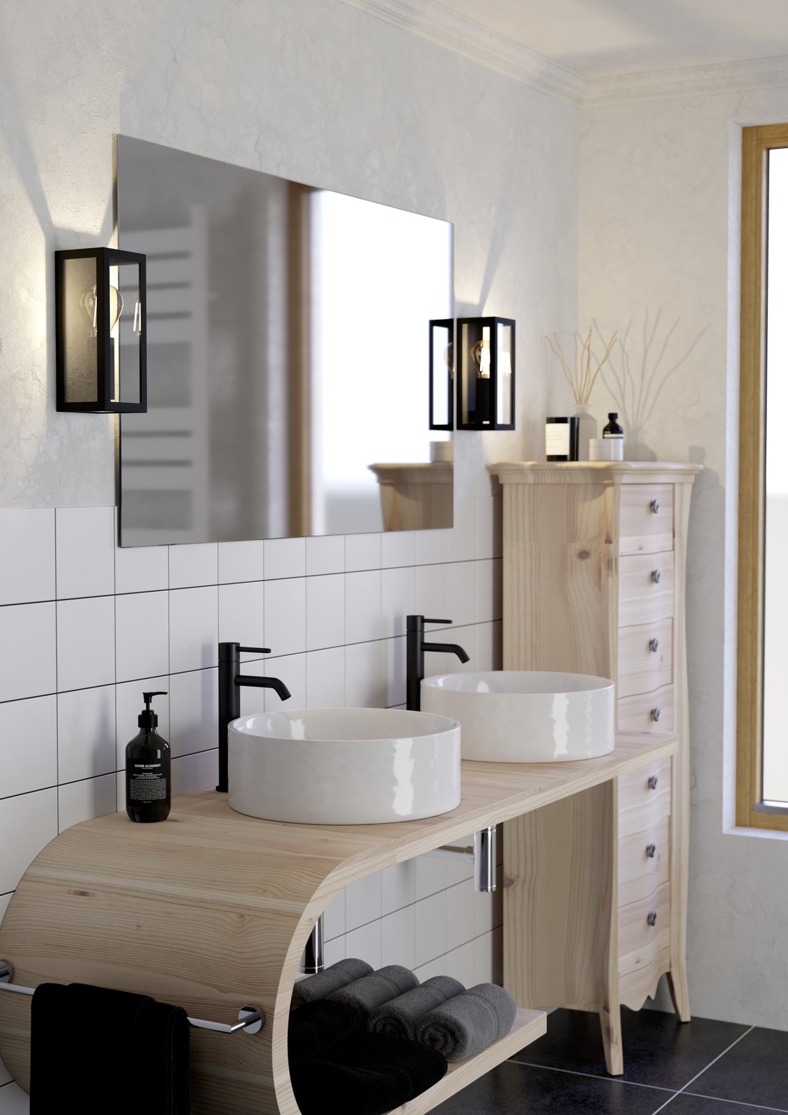Veľmi pekné, štýlové svietidlá do kúpeľne vyrobené z ocele v čiernej farbe a zo skla v čírej farbe. Je možné ich osadiť chytrou LED žiarovkou a meniť tak intenzitu a teplotu chromatičnosti svietenia. |
