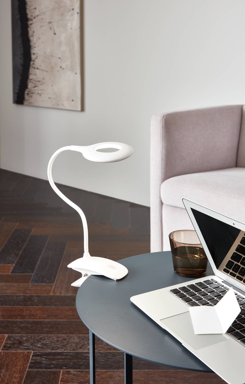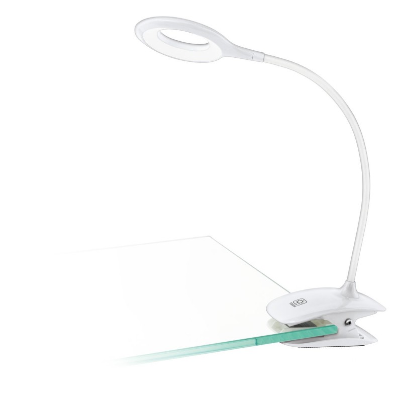 Kancelárska lampička s klipom sa ľahko umiestni na stôl alebo policu. Okrem kancelárií sa hodí aj do detských alebo študentských izieb. Je vyrobená z plastu v bielej farbe.