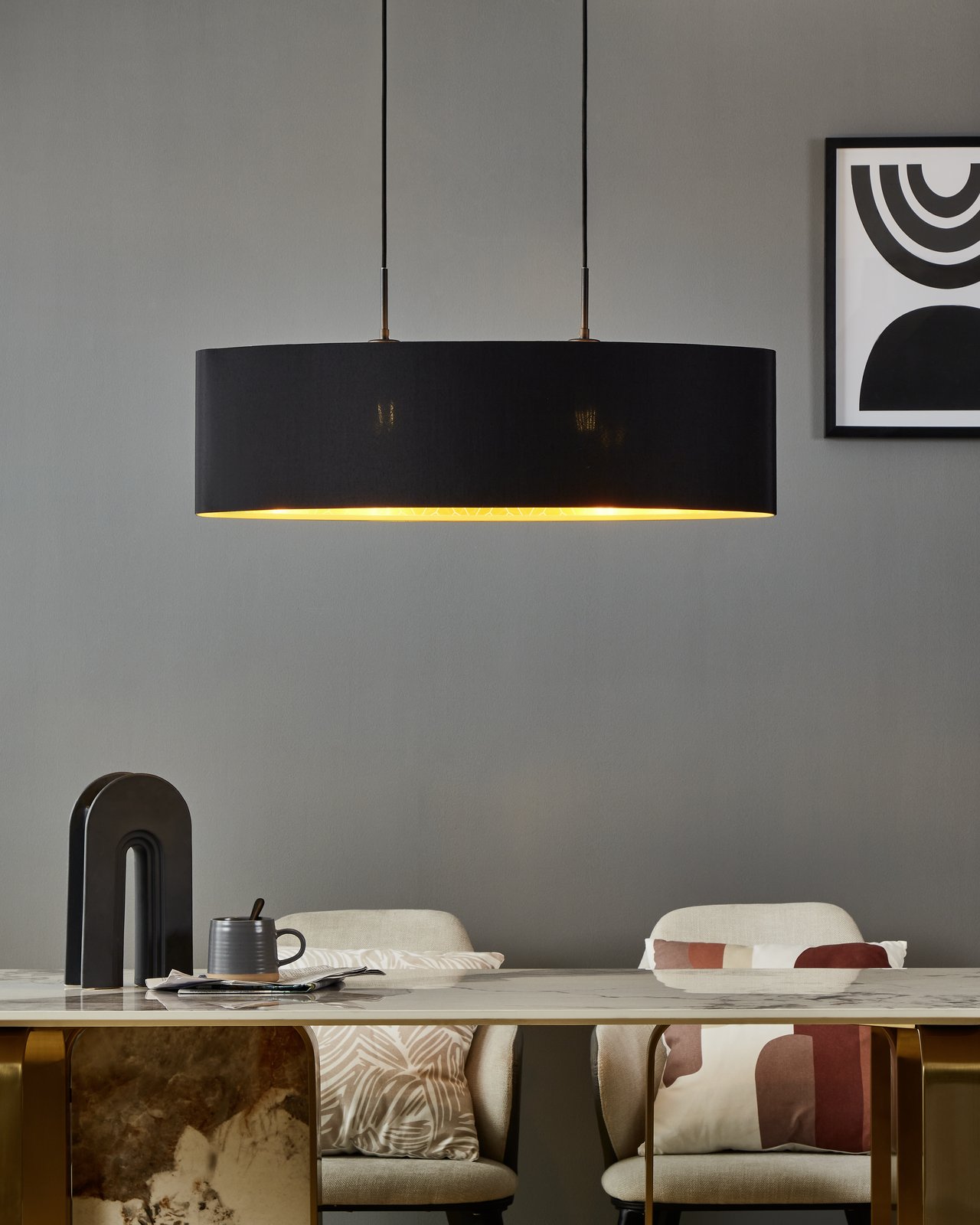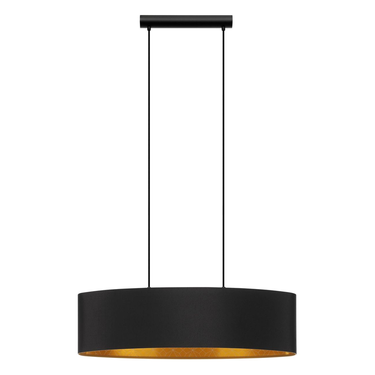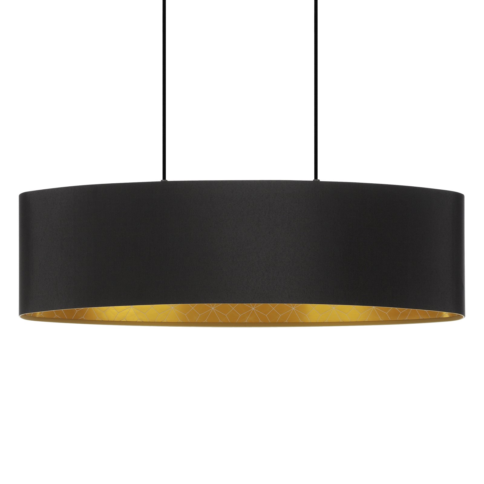 Moderné a elegantné svietidlá vyrobené z ocele v čiernej farbe a textilu v čiernej a zlatej farbe s dekorom. Sú vhodné do celého interiéru. Vynímať sa budú v obývacej izbe, kuchyni, jedálni, spálni i predsieni. Je možné ich osadiť chytrou LED žiarovkou a pomocou aplikácie v smartfóne je stmievať a meniť teplotu a farbu svietenia. |