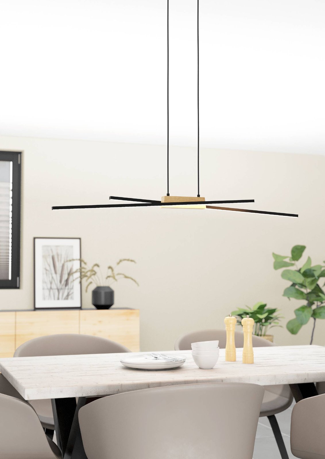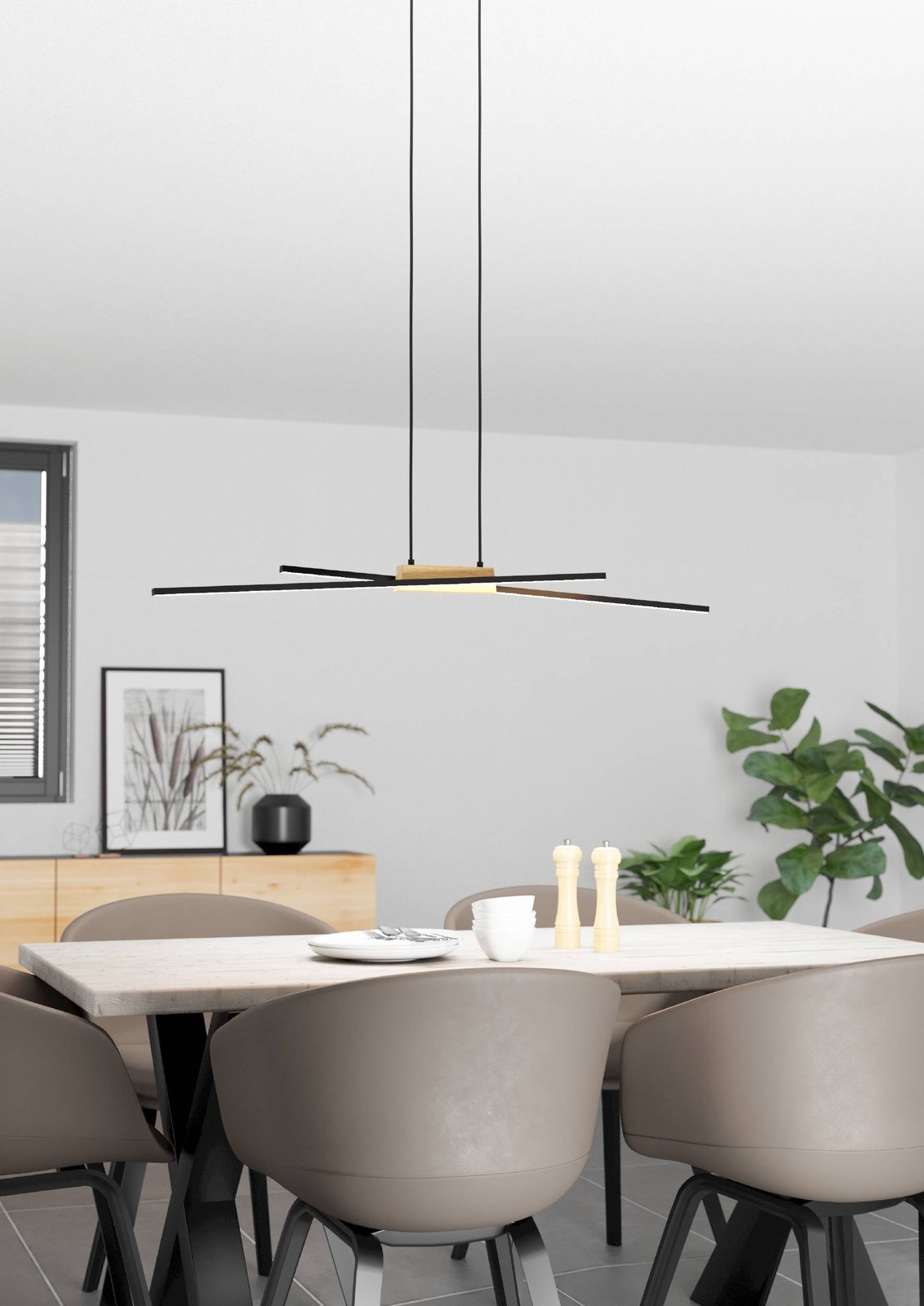Veľmi štýlové a moderné svietidlá v kombinácii hliníka, ocele, plastu a dreva. Kovové časti sú čierne, plast je biely a drevený prvok je v prírodnej hnedej farbe.