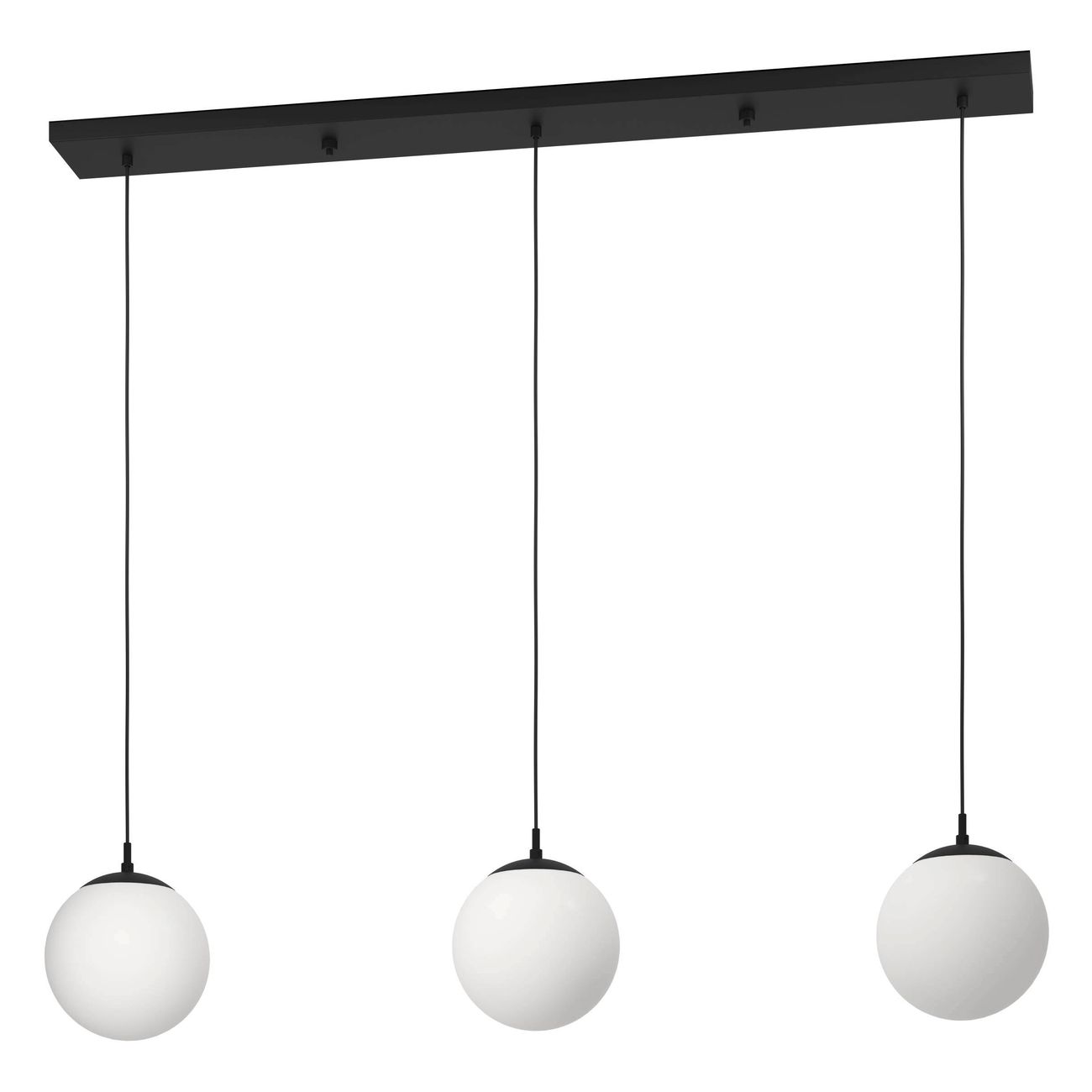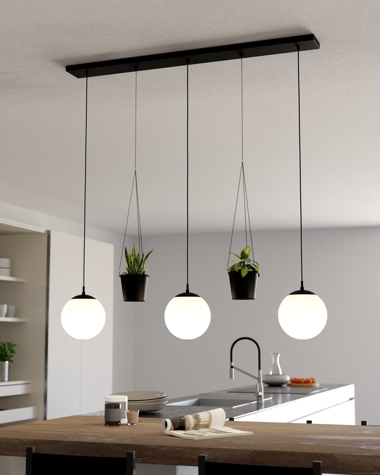 Moderné lustre do kuchyne, jedálne alebo do obývacej izby. Vynímať sa budú v kuchyni nad kuchynským ostrovčekom alebo v jedálni nad jedálenským stolom. Sú vyrobené z ocele a tienidlá v tvare gule sú z matného opálového skla. |