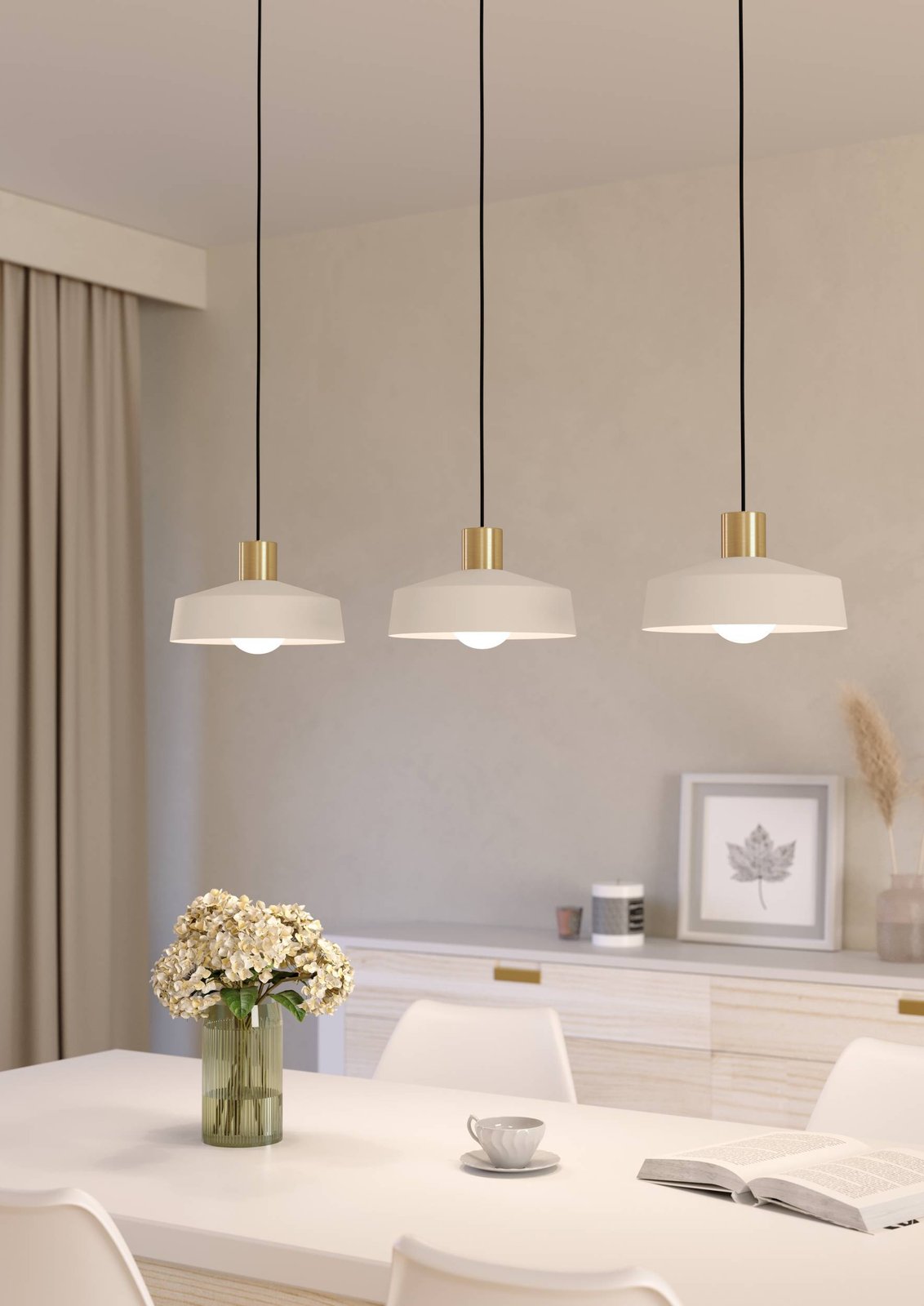 Moderné závesné svietidlá vyrobené z ocele v pieskovej farbe s prvkami mosadznej. Je možné ich osadiť chytrými LED žiarovkami a pomocou aplikácie v smartfóne je stmievať a meniť teplotu a farbu svietenia. Sú vhodné nielen do kuchýň a jedální, ale aj do obývacích izieb. |