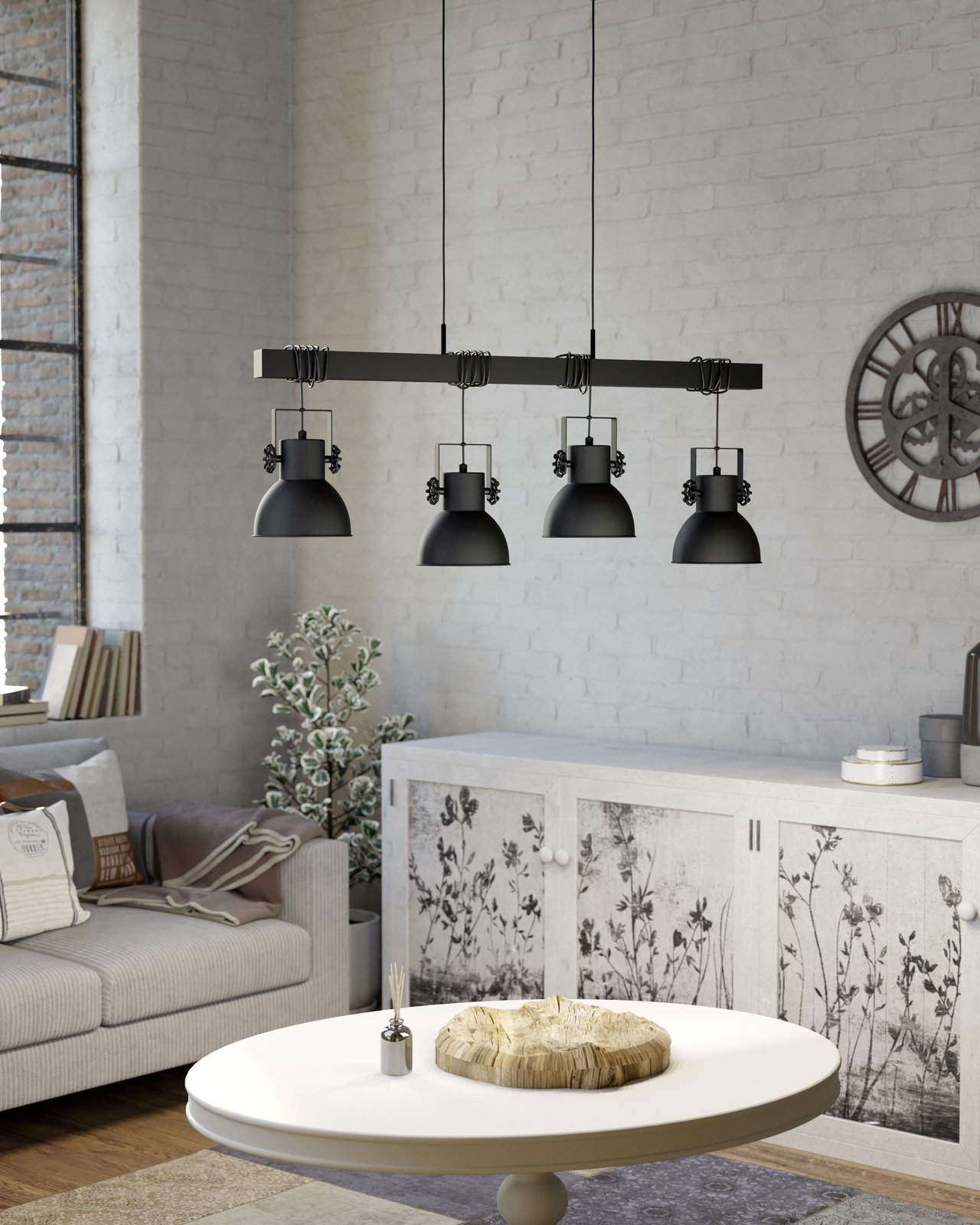 Zaujímavé závesné svietidlo vyrobené z ocele a dreva v čiernej farbe. Hodí sa do interiéru ladeného do vintage štýlu. Je možné ho osadiť šikovnými LED žiarovkami a pomocou aplikácie v smartfóne ho stmievať alebo meniť teplotu a farbu svietenia.
