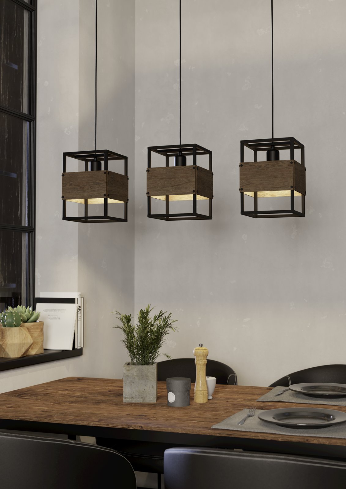 Dizajnové svietidlá Evesham sa skvele hodia do obývacích izieb, kuchýň, spální, chodieb a predsiení, kde budú tvoriť veľmi zaujímavý prvok. Sú vyrobené z ocele v čiernej farbe a z dreva v hnedej farbe. |