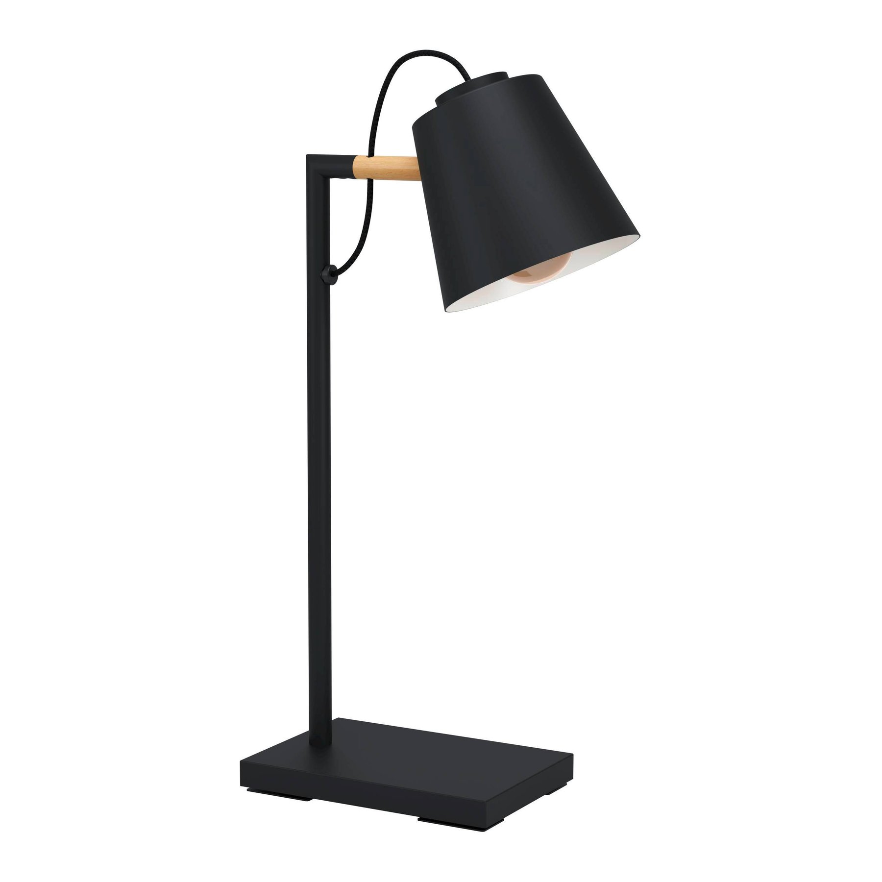 Lampa a stolná lampička v modernom štýle. Sú vyrobené z ocele v čiernej farbe s kombináciou drevených prvkov. Klobúk je z ocele v čiernej a krémovej farbe. |
