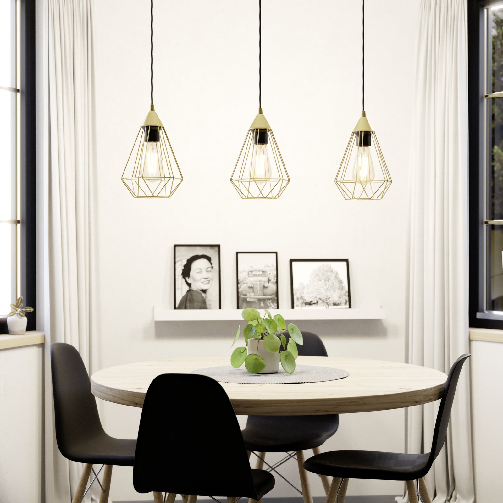 Moderné kovové svietidlá, vyrobené z ocele vo farbe brúsená mosadz a kábel, na ktorom sú svietidlá zavesené je čierny. Sú vhodné do kuchýň a jedální ale aj obývacích izieb. |