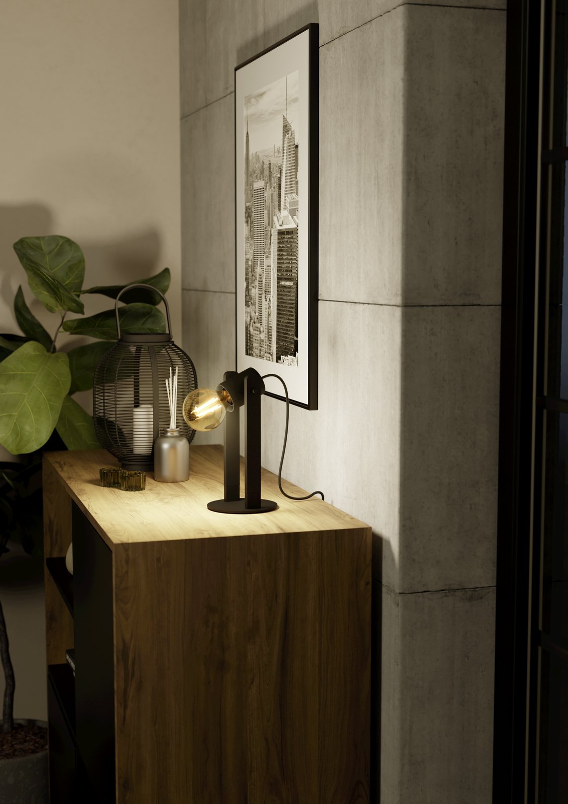 Zaujímavá stolná lampička vyrobená z dreva a ocele v čiernej farbe. Je vhodná do obývacích izieb na komodu alebo do spálne na nočné stolíky. Hlavu lampičky je možné nakláňať smerom hore a dole, takže si posvietite smerom, ktorý práve potrebujete. |