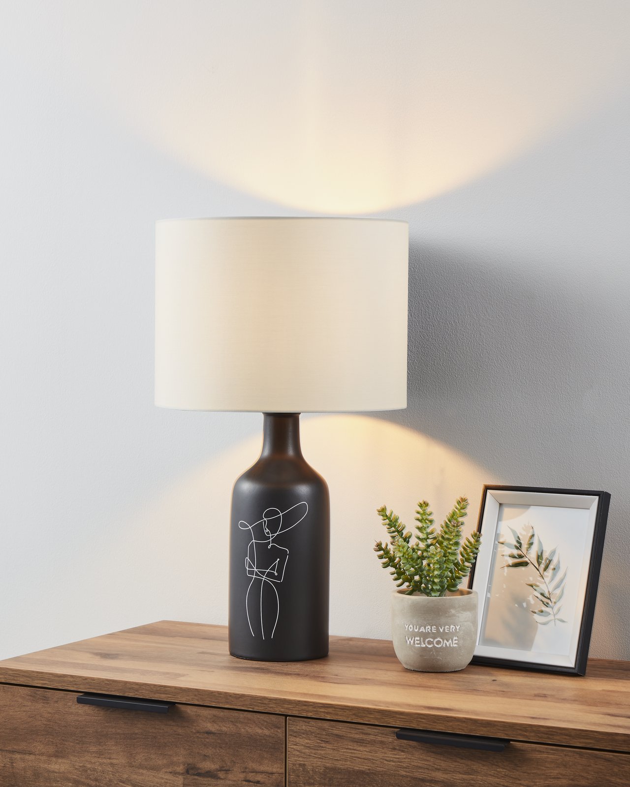 Moderné a elegantné lampičky vhodné do obývacej izby alebo spálne na komodu alebo nočné stolíky. Sú vyrobené z keramiky, na ktoré je jednoduchá kresba a textilu. |