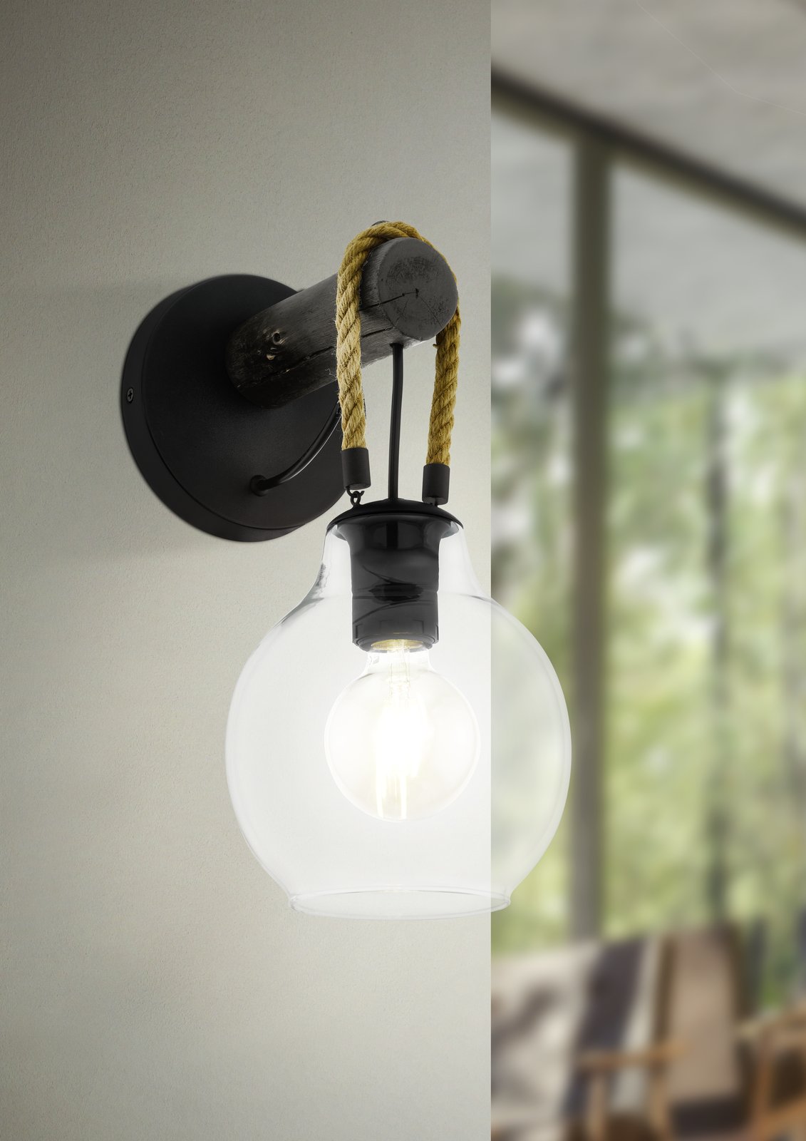 Zaujímavé svietidlá vhodné do interiérov zariadených vo vintage štýle. Základňa je vyrobená z ocele v čiernej farbe, na konci ktorej visí na povraze guľa z číreho skla. Svietidlá je možné osadiť chytrou LED žiarovkou a pomocou aplikácie v smartfóne svietidlo stmievať alebo meniť teplotu a farbu svietenia. |