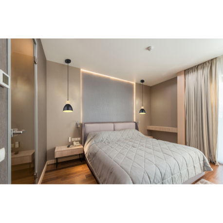 Moderné lustre z matného čierneho kovu a prvkov z imitácie dreva. Káble sú výškovo nastaviteľné. Možno ich vybaviť inteligentnou LED žiarovkou na zmenu intenzity a farby svetla. |