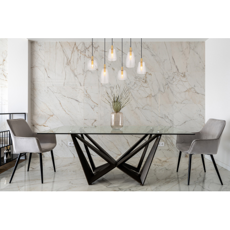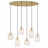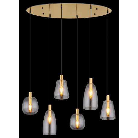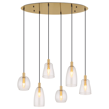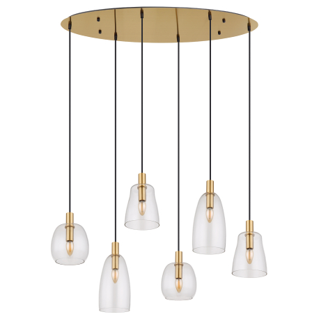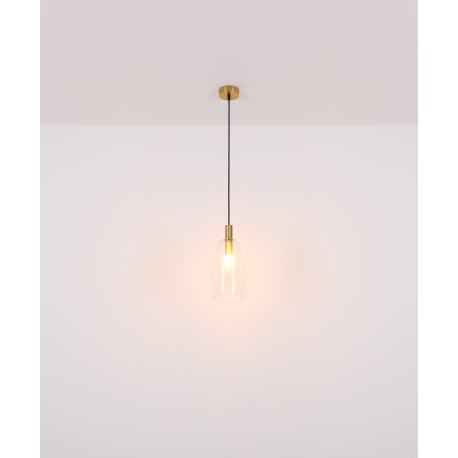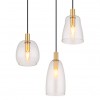 Závesné svietidlá vhodné do kuchýň, jedální, ale aj obývacích izieb. Sú vyrobené z hliníka a kovu v mosadznej farbe a tienidlá sú zo skla v čírej farbe. |