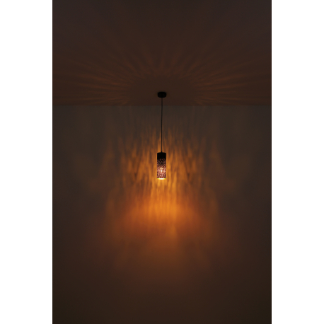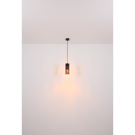 Moderné lustre vhodné do kuchyne alebo jedálne nad jedálenský stôl alebo kuchynský ostrovček, ale aj do obývacej izby. Sú vyrobené z kovu v elegantnej matnej čiernej a zlatej farbe, tienidlá sú zavesené na textilnom kábli. Tienidlo je dierované, čo po rozsvietení vyzerá veľmi efektne. |
