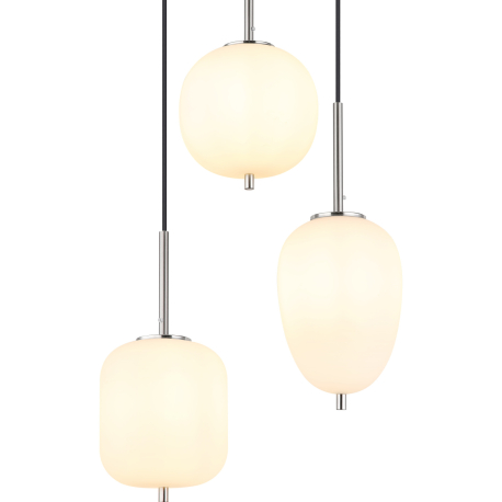 GL-15345-3NO Závěsné svítidlo kov nikl matný, sklo bílé, kabel PVC černý, možnost nastavení výšky, 3 různá skla, Ø:460 mm, V:1200 mm, Ø:stínítka: 1x15,8cm, 16,5cm, 18,5cm, bez žárovek 3x E14 40W 230V - Blacky Globo