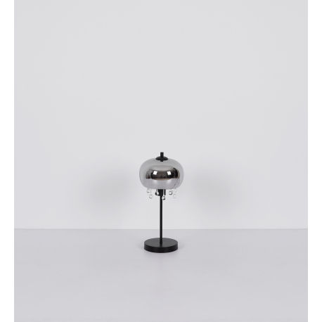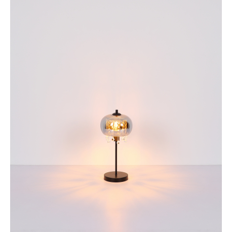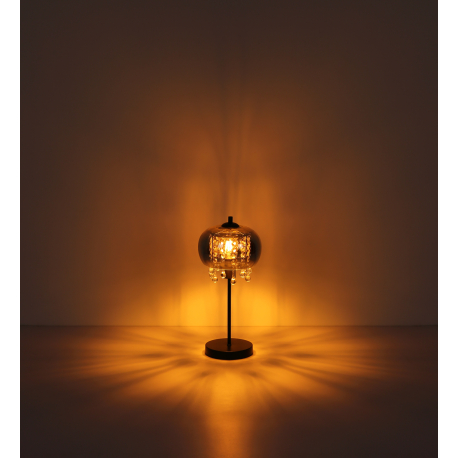 Moderná lampička vhodná na dotvorenie atmosféry vo vašom interiéri. Je vyrobená z kovu v matnej čiernej farbe, z dymového skla a z krištáľkov vyrobených z číreho skla. |