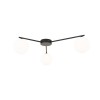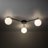 Moderné stropné svietidlá vyrobené z kovu, skla a plastu v elegantnej čiernej farbe. Kovová základňa má na ramená, na ktorých sú zavesené sklenené gule. |