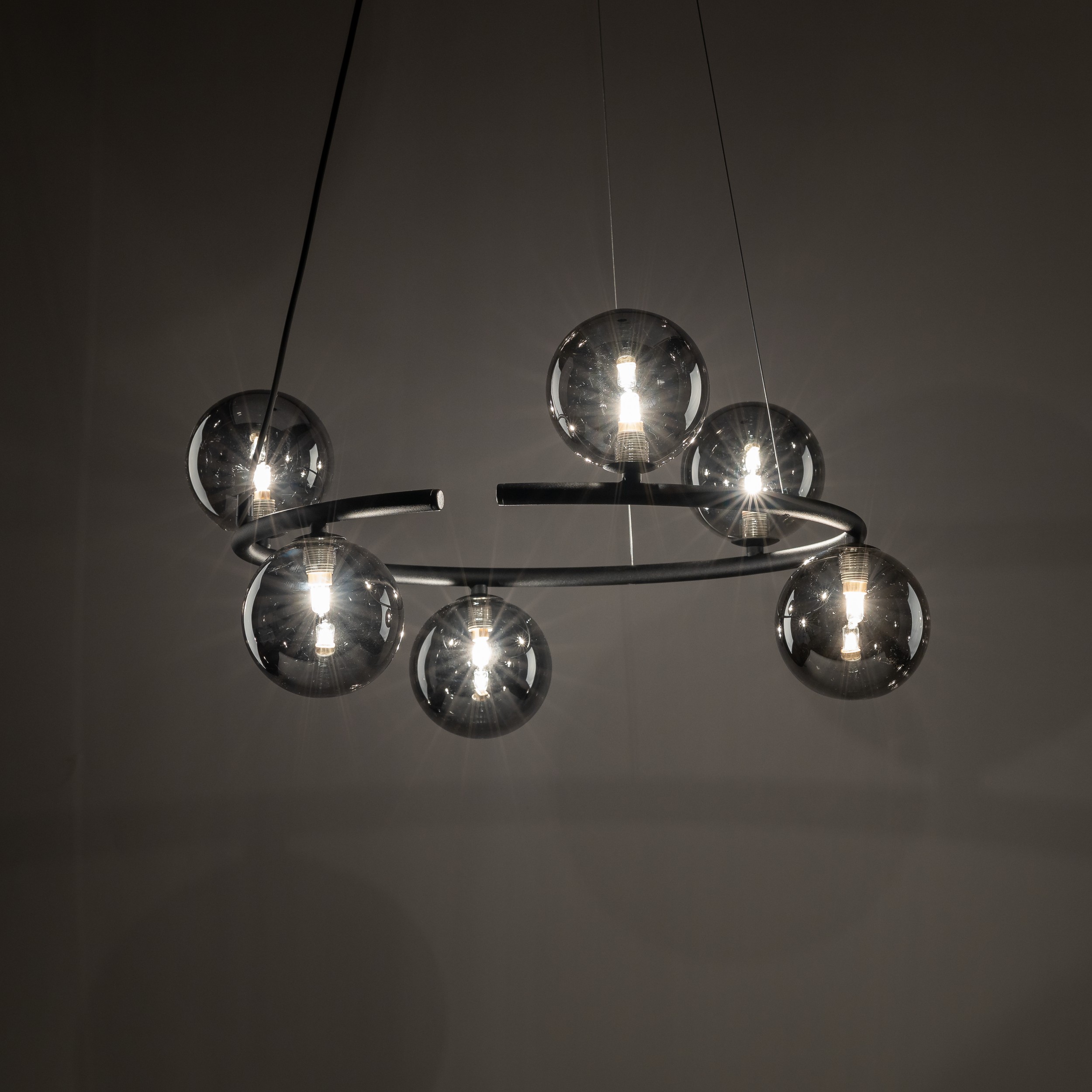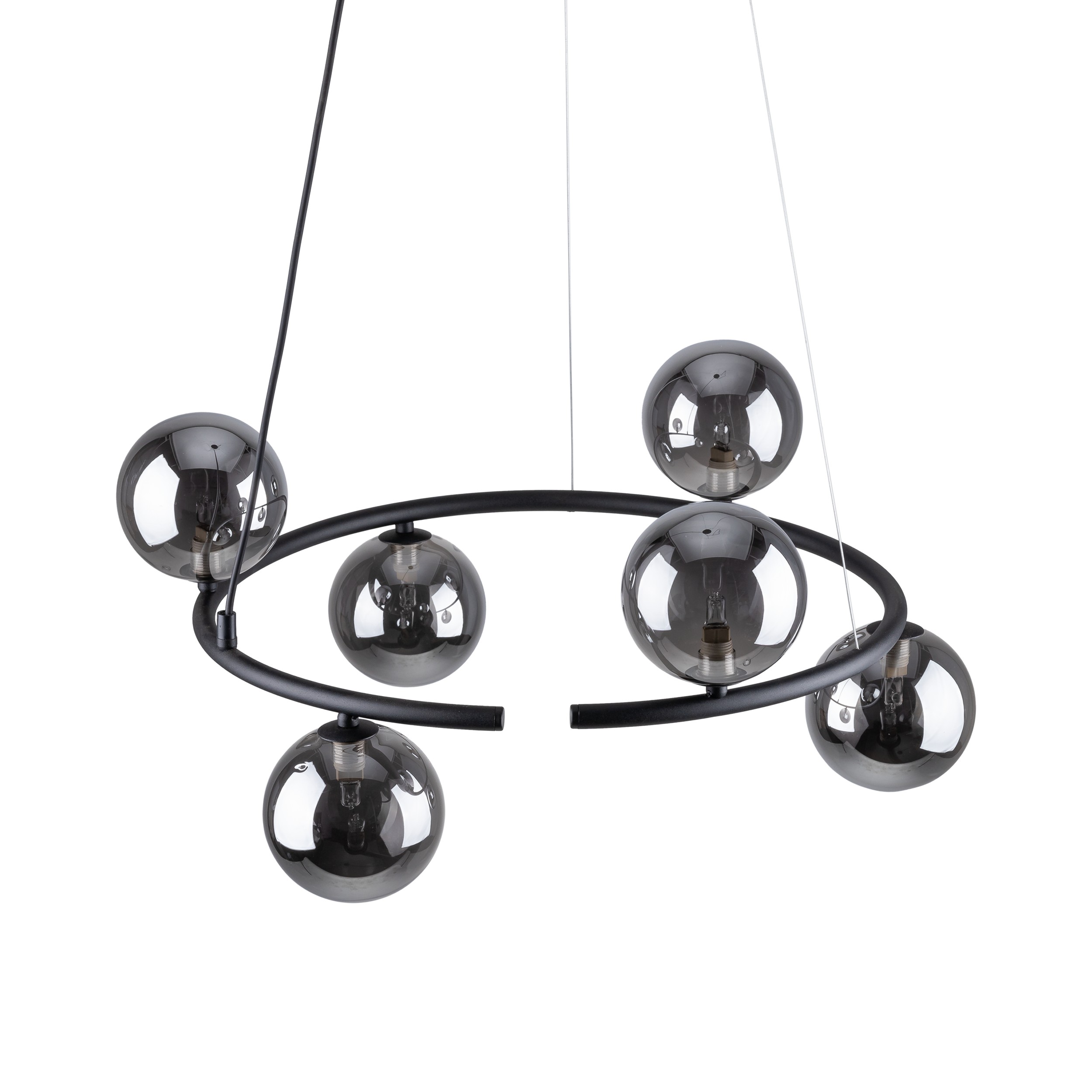 Zaujímavé lustre vyrobené z kovu, plastu a skla. Pôsobí luxusným dojmom. Vo vašom interiéri budú tvoriť zaujímavý prvok. Na čiernej základni sú umiestnené sklenené gule v čiernej farbe. |
