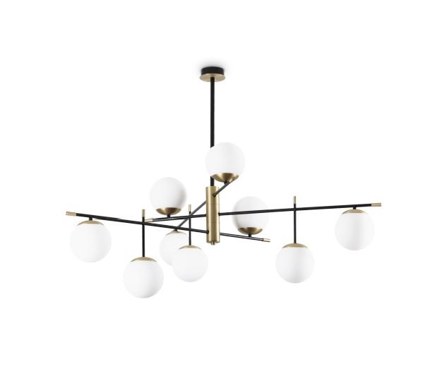 Elegantné závesné svietidlá vyrobené z kovu a skla. Základňa svietidla je v matnej čiernej farbe, doplnená o matnú mosadznú, sklenené gule tienidiel sú v bielej farbe. Sú vhodné do obývacích izieb, kuchýň, spální, predsiení a pod. |