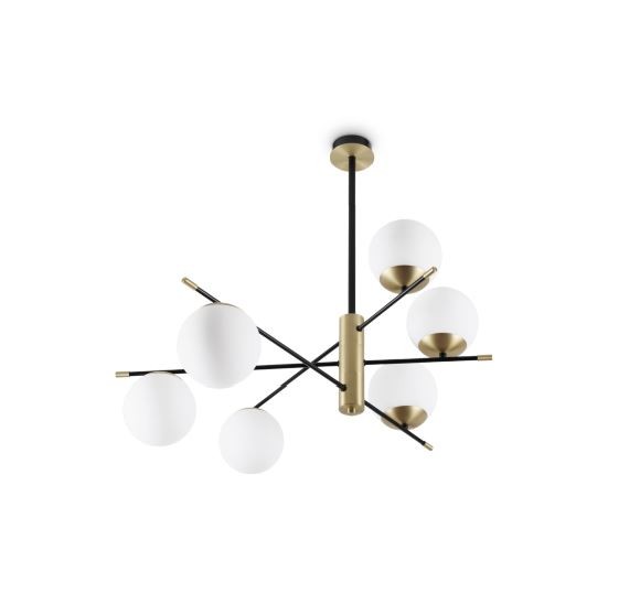 Elegantné závesné svietidlá vyrobené z kovu a skla. Základňa svietidla je v matnej čiernej farbe, doplnená o matnú mosadznú, sklenené gule tienidiel sú v bielej farbe. Sú vhodné do obývacích izieb, kuchýň, spální, predsiení a pod. |