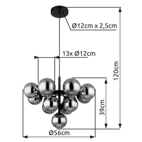 GL-56143-13 Závěsné svítidlo, kov černý, skleněné koule kouřové barvy, textilní kabel černý, výškově nastavitelné, ø:560mm, V:1200mm, bez žárovek 13xG9 LED, max. 5W 230V - Grappy BM+GM