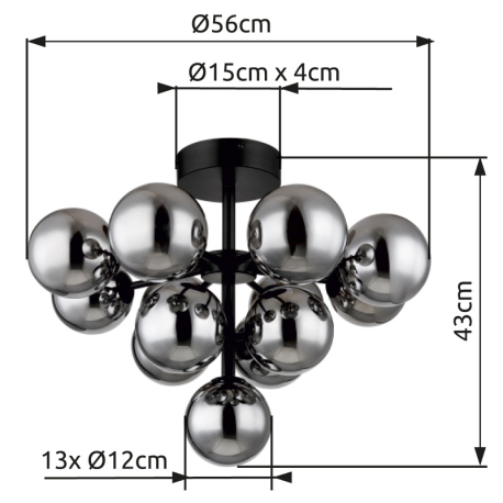 GL-56143-13D Stropní svítidlo, kov černý, skleněné koule kouřové barvy, ø:560mm, V:430mm, bez žárovek 13xG9 LED, max. 5W 230V - Grappy BM+GM