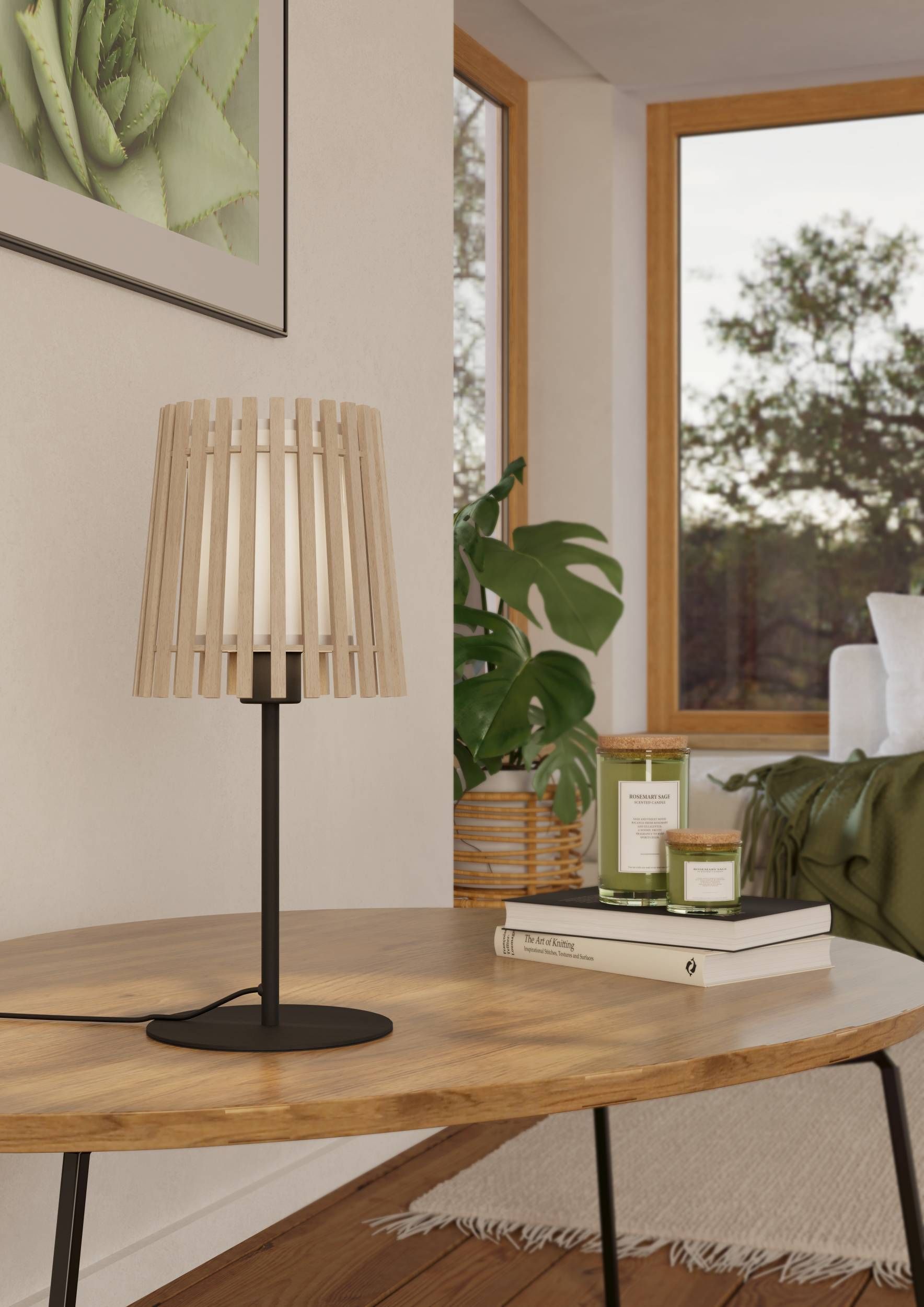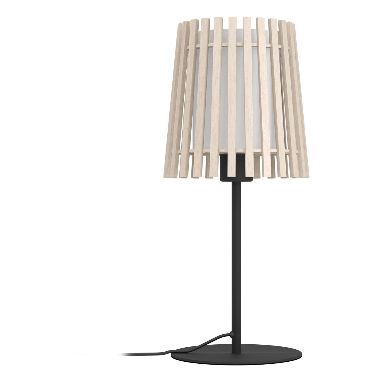 Lampy Fattoria majú oceľovú čiernu nohu a tienidlo z dreva a textilu v prírodnej a bielej farbe.