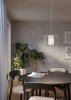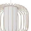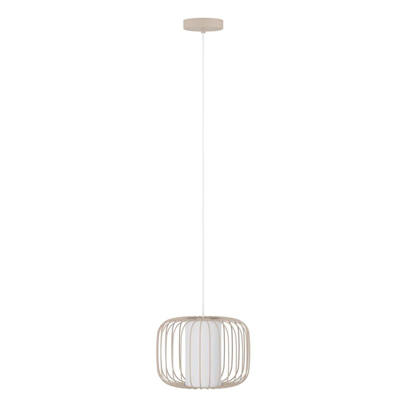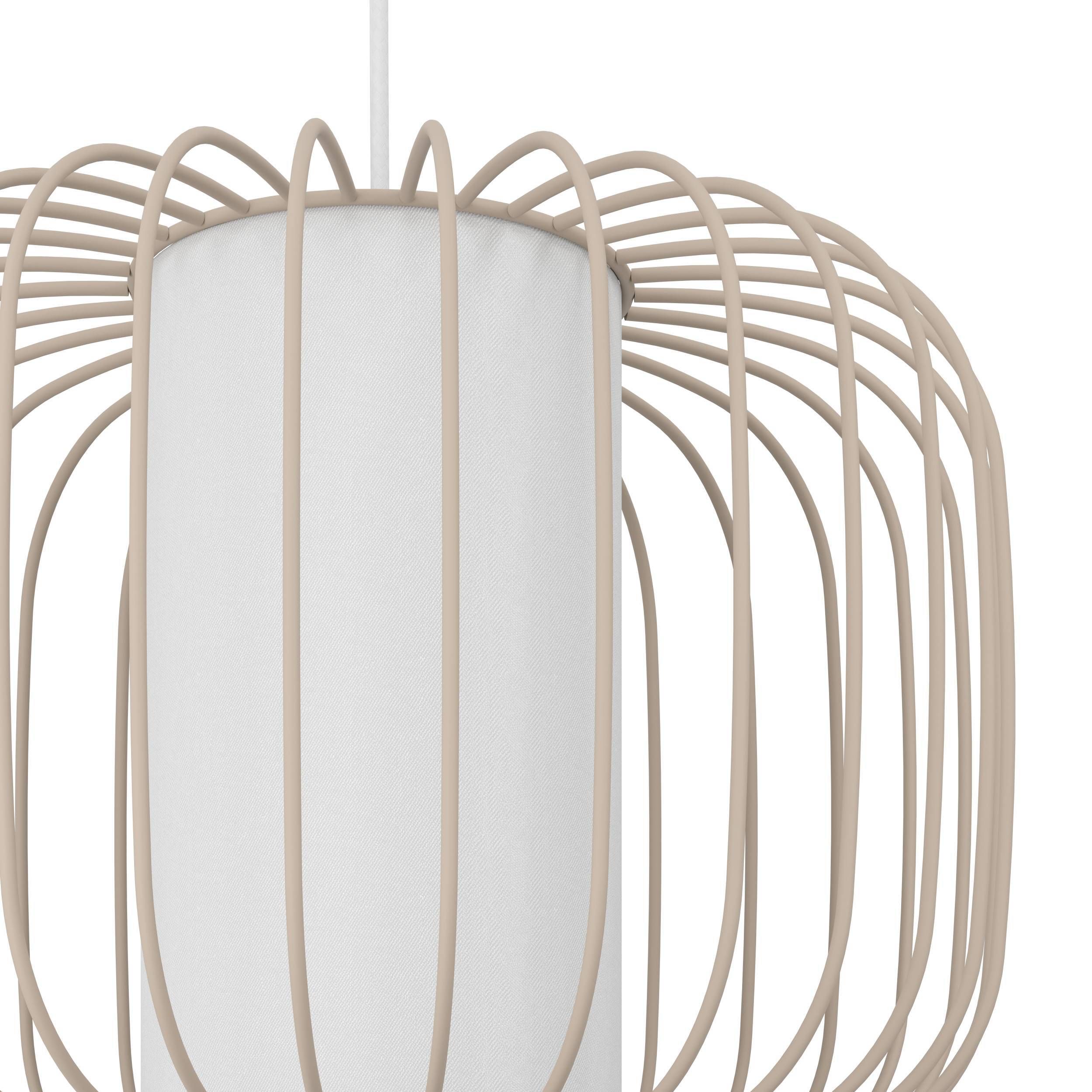 Moderné závesné svietidlá vyrobené z ocele v pieskovej farbe s textilným valcom v bielej farbe uprostred kovového tienidla. |