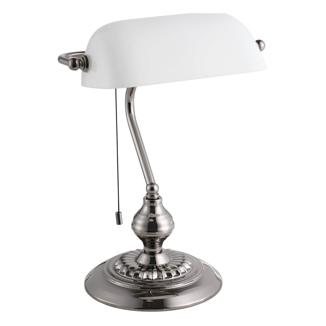 Stolová lampička, vhodná do kancelárií a pracovní. Štýl bankový. Je vyrobená z kovu vo farbe matný nikel nero a tienidlo je z bieleho saténového skla. S vypínačom. |