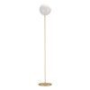 Elegantné svietidlá vyrobené z ocele v kartáčovanej mosadze a tienidlá sú sklenené gule v matnej opálovej farbe. |