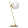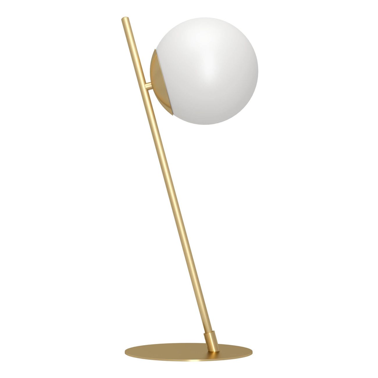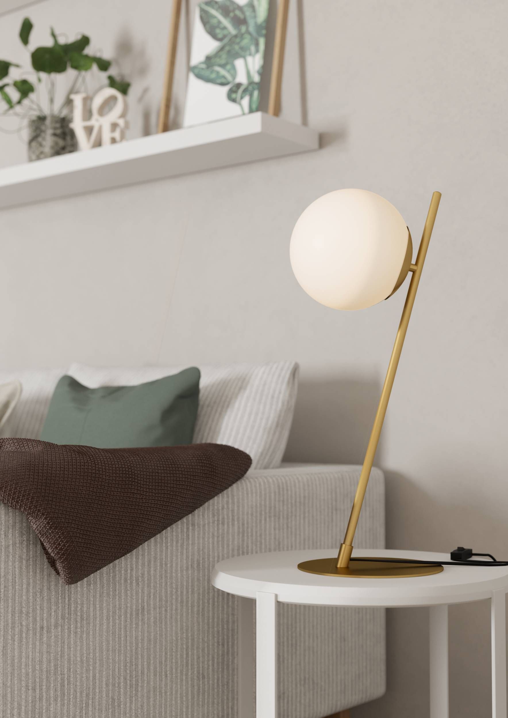 Elegantné svietidlá vyrobené z ocele v kartáčovanej mosadze a tienidlá sú sklenené gule v matnej opálovej farbe. |