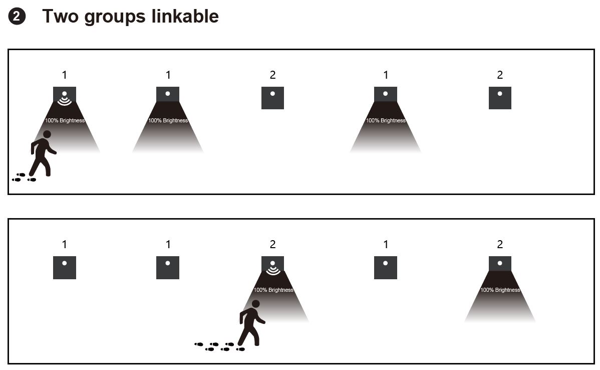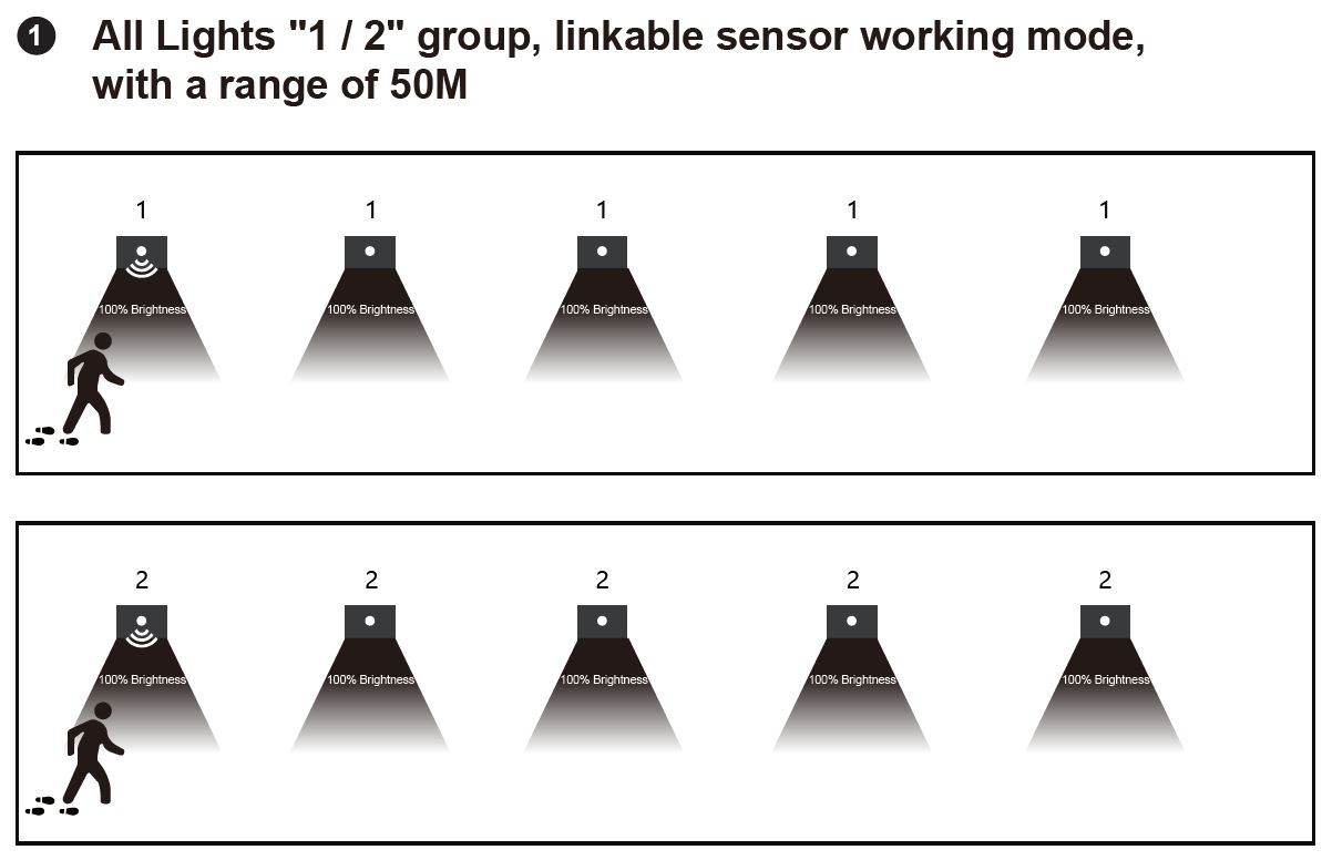 MODE 1 - skupinové spínanie svietidiel s identickým režimom (1). Zapne sa svetlo, ktoré detekuje pohyb, a súčasne sa zapnú všetky svietidlá, pre ktoré sme nastavili mod 1 (vyšle sa bezdrôtový impulz do týchto svietidiel)