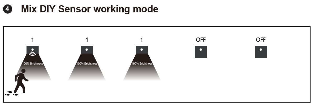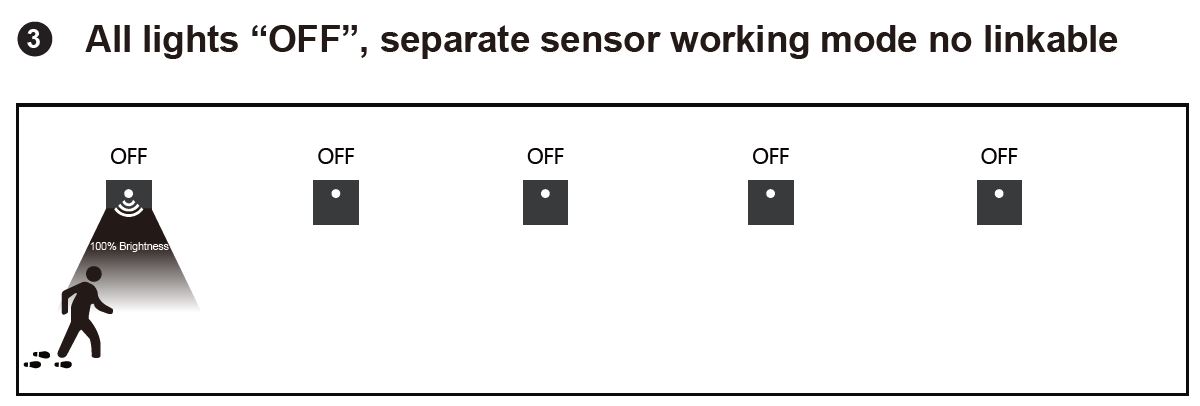 MODE OFF - svietidlo pracuje samostatne a pri detekcii pohybu sa spína jednotlivo.