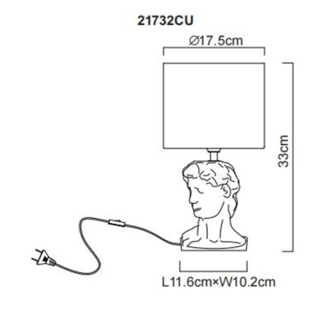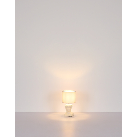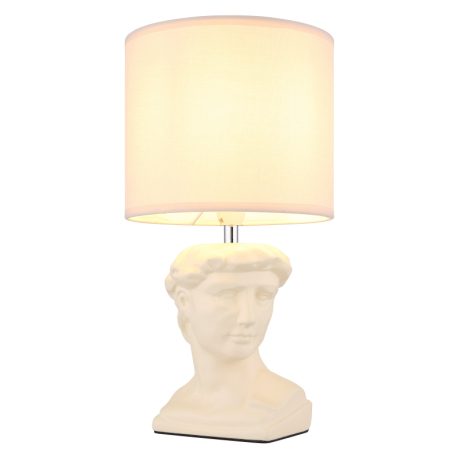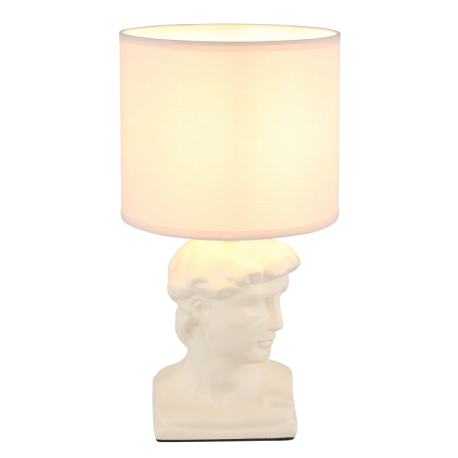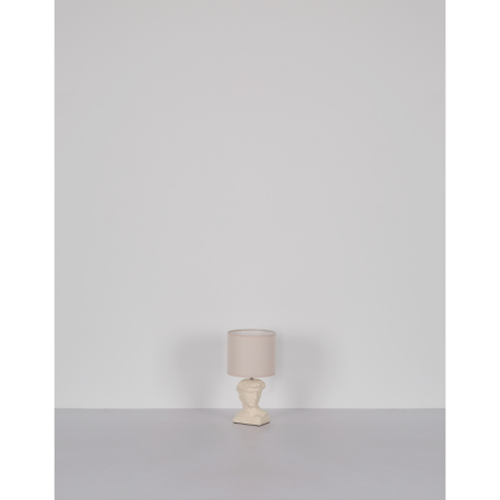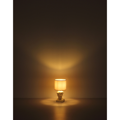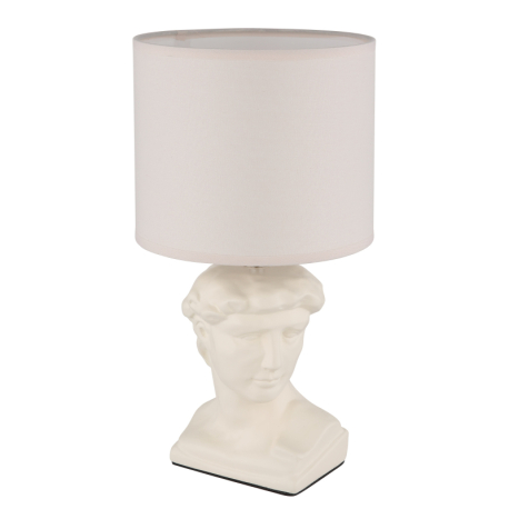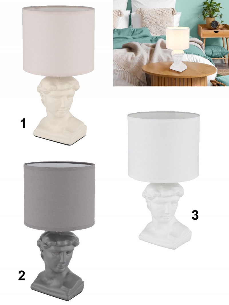 Jednoduché, elegantné stolné lampičky vhodné do obývacích izieb, spální, predsiení a pod. Základňa má tvar bysty Césara a je vyrobená z keramiky, tienidlo je okrúhle, textilné. So závitom E14. Lampičky sa dodávajú bez žiaroviek. Dĺžka kábla 130 cm. |
