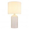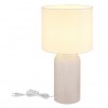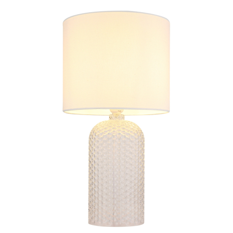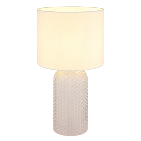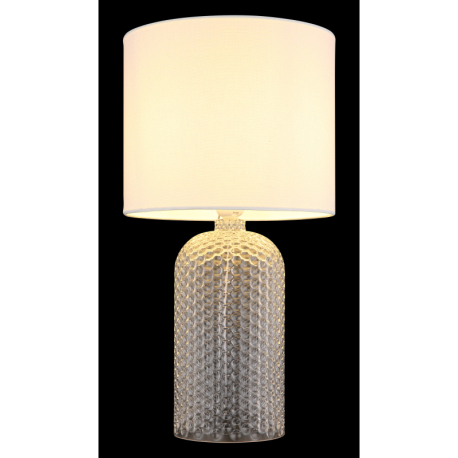 Štýlová stolná lampička vyrobená zo skla a textilného tienidla. Sklenená noha svietidla je dekorovaná, čo jej dodáva zaujímavý vzhľad. Skvele sa hodí do obývacích izieb, spální i predsiení na dotvorenie príjemnej atmosféry. So závitom E27. Žiarovky nie sú súčasťou balenia. Dĺžka kábla 130 cm. |