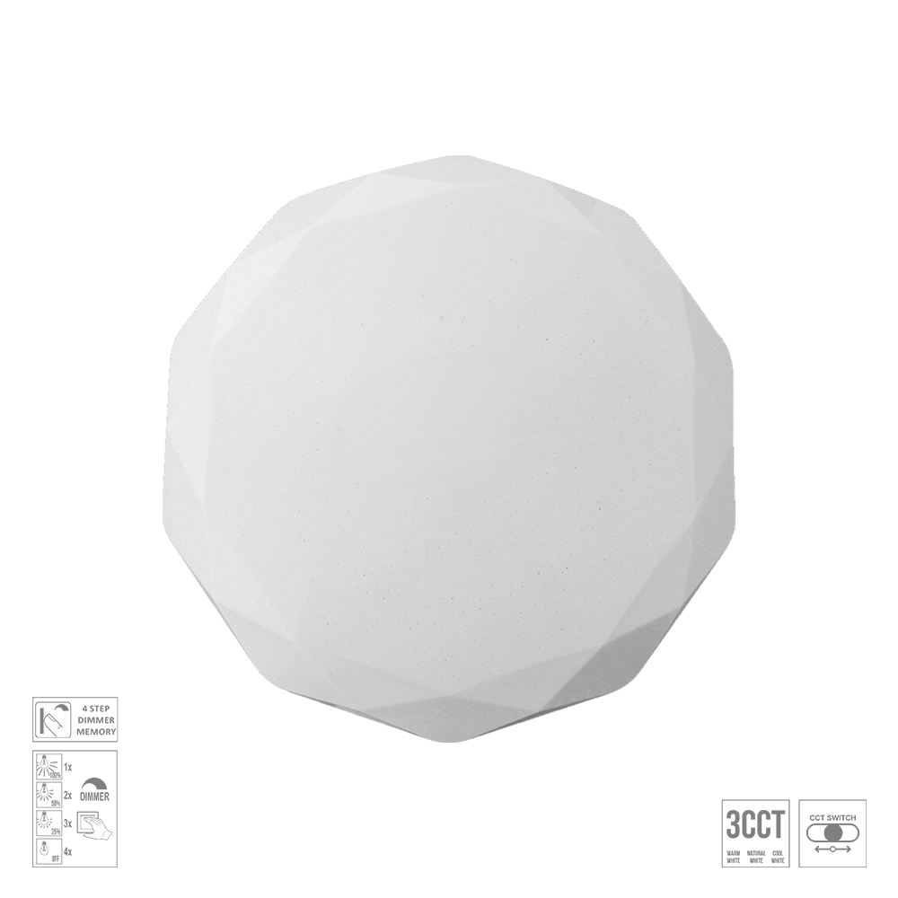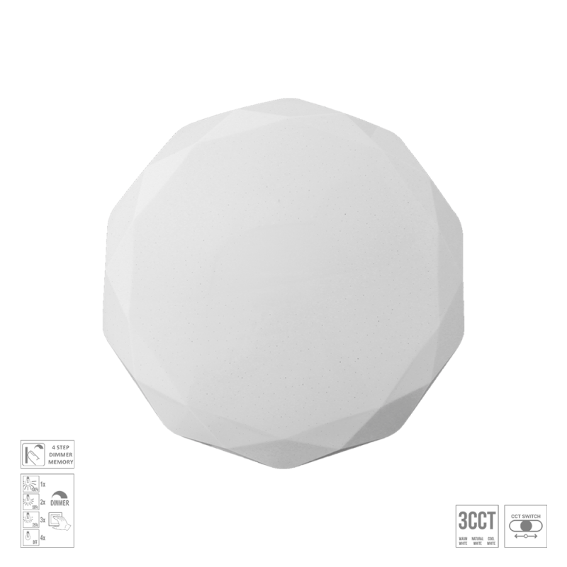 Stropní svítidla Iridio jsou vyrobené z kovu a akrylu v bílé barvě. Skvelo sa hodí do detských izieb a moderných interiérov vďaka silnému efektu, ktorý svítidlo po rozsvietení vytvára. Životnosť svítidla 20 000hod. Teplotný rozsah je 3000K-6500K. Možnosť nastavení pamäti posledného svietenia.