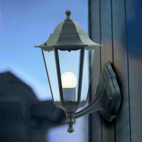 | Krásné elegantní venkovní nástěnné svítidlo v retro designu z černého kovu se skleněnými průhledy s hlavou lampy směřující nahoru | |